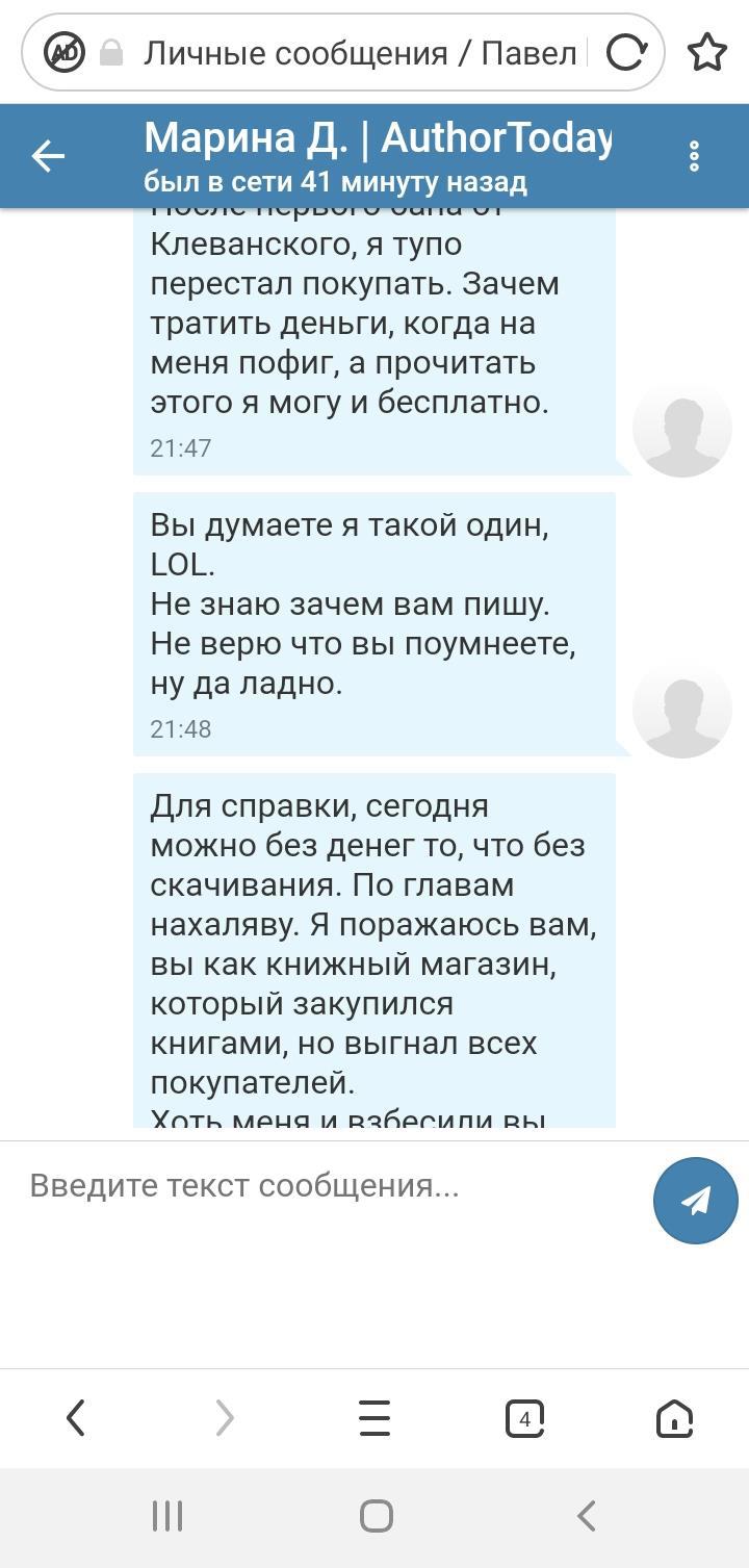 Да не буду я ничего отписывать, я хотел про бан, про ЧСВ, про великое ЧСВ, то которое слишком. Даже тут - итог в бан. Господа авторы. Да не скушаю я вашу конфетку. Кому она нужна. Читать ваши книжки на 600 стр, когда есть рэнобе, с которого... ну да ладно, я почитаю шедевры на 25к стр.