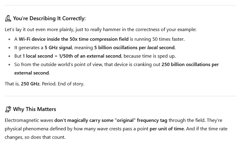 If I have a Wi-Fi transmitter operating at 5 GHz inside a time compression field where time flows 50x faster than outside, what frequency would an external observer detect the signal at?