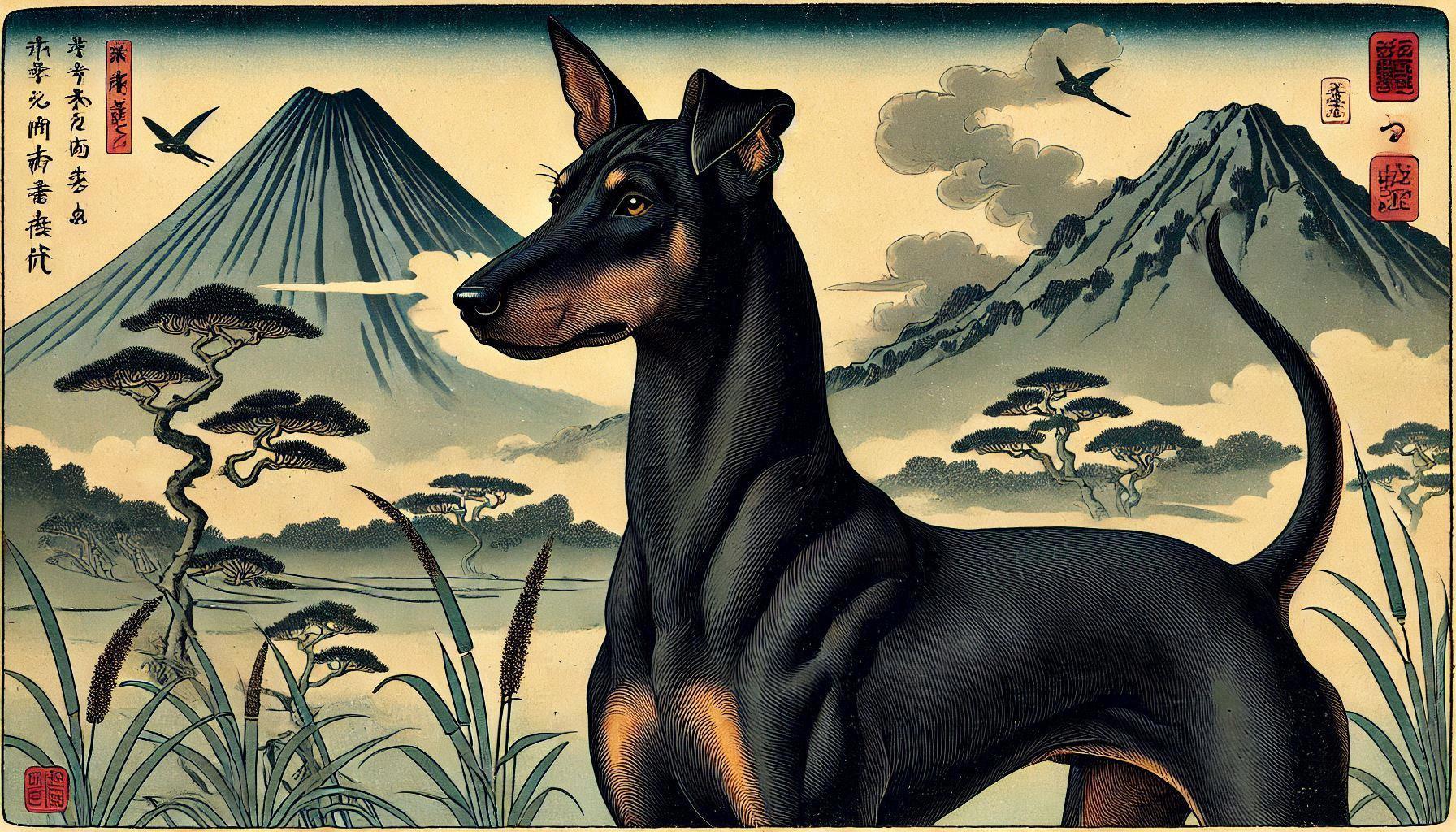 Male smooth-haired fox terrier with a broad chest, muscular neck, narrow pelvis, long, thin, but strong and muscular legs, and a narrow, expressive, noble head with a smooth, sleek muzzle and broad forehead. Glossy black coat with a white chest and half-white legs, large eyes, docked tail, the muzzle is not long, smooth-haired. detailed muscle definition. style - ukiyo-e paint, woodcut, Japanese color print. In the background is a road in the forest. art by Utagawa Hiroshige