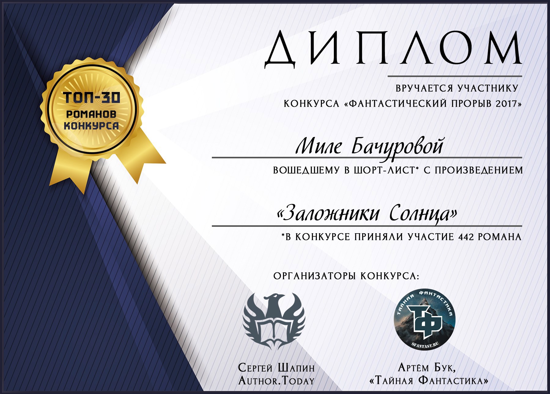 Выдается всем участникам конкурса романов «Фантастический прорыв 2017»