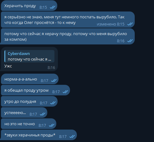 Ну и с Олегом у нас связь через задницу - разные часовые пояса, так ещё и мой график колбасит, как маркитантскую лодку посреди Великой Армады.