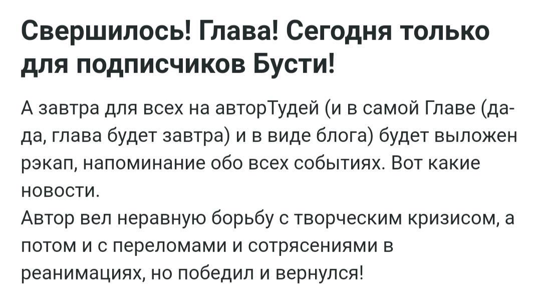 Да там по подписке на самом деле эта информация, я хз можно ли полностью посты копипастить, но если вкратце там просто нейрокартинки и как раз инфа что автор жив, проходит реабилитацию после чего-то и возможно потом либо продолжит книгу либо "Уйдет от мира", что бы это ни значило