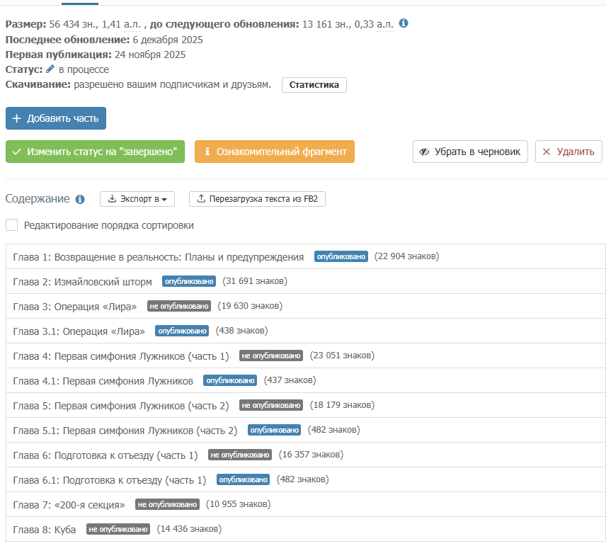Всё верно. Серым обозначен черновик — там объём больше, поскольку это полноценная глава. Поскольку книга ещё не завершена и не может поступить в продажу, я публикую техническую главу-отчёт со скриншотом. Так читатель отслеживает прогресс и примерные сроки. Планируемый объём — от 400 000 знаков, пока готово 158 000.