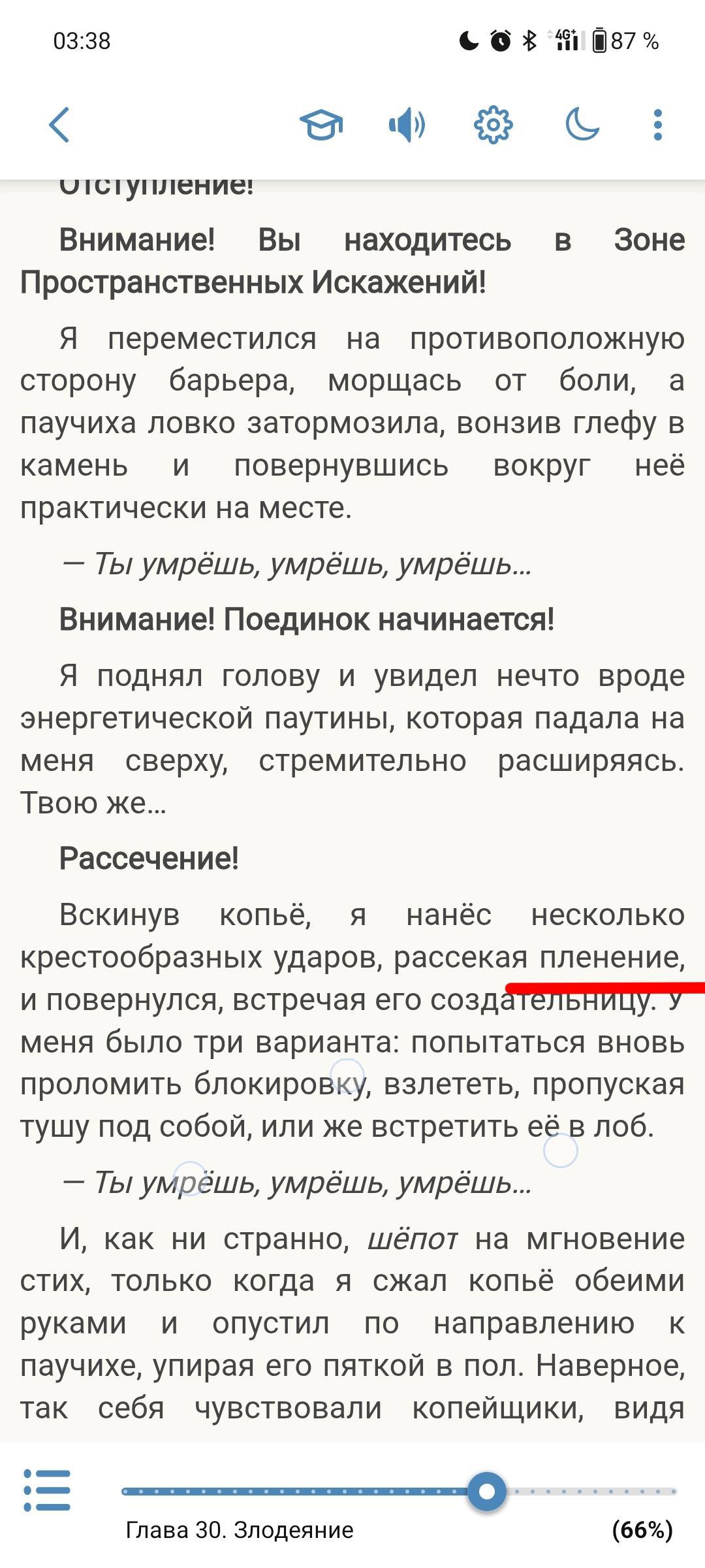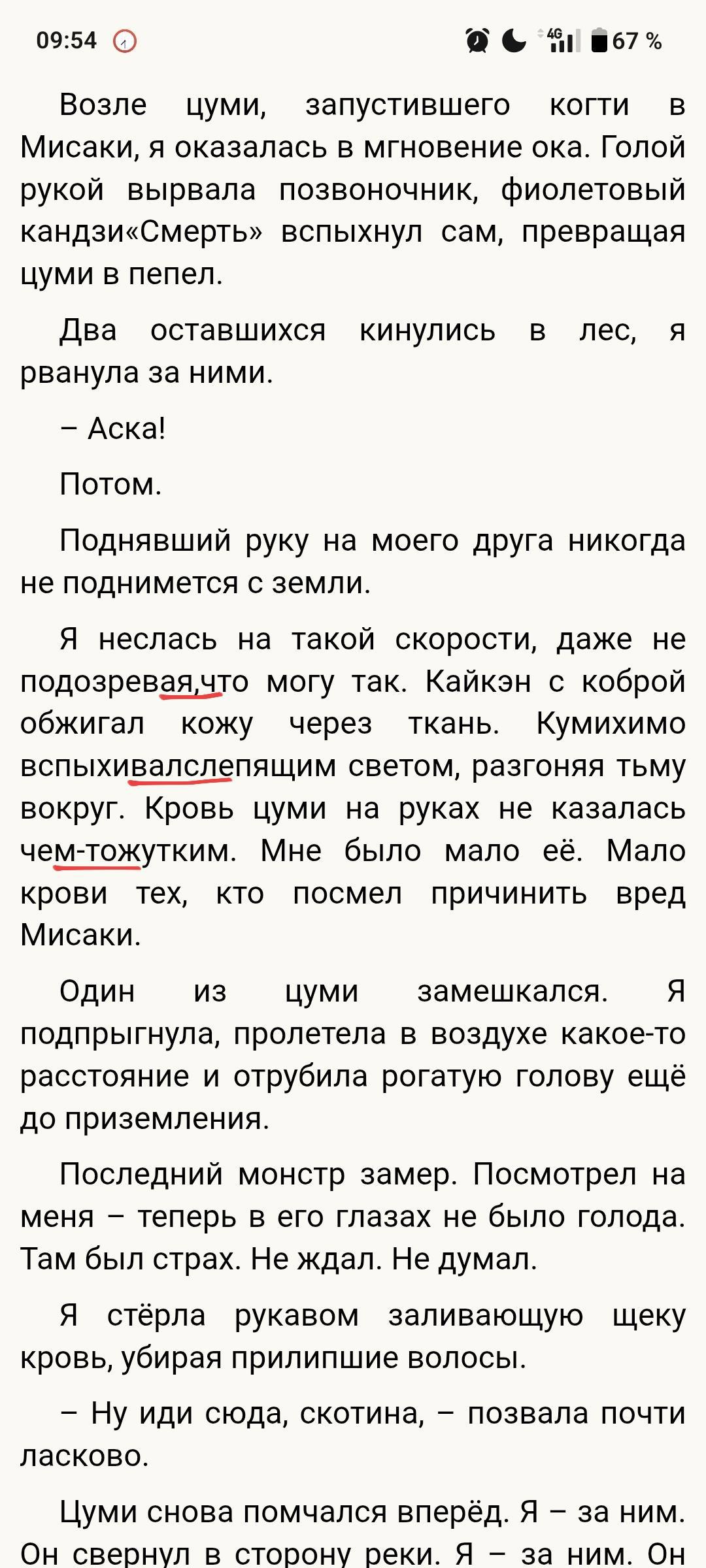 И ещё именно по 4 книге, в районе 12-17 глав есть пробелы пропущенные, с десяток точно, но вроде даже больше. Например в самом начале 12 главы "Чтоямогу". К концу книги вроде пропали, хотя опечатки порой встречаются. К сожалению в приложении author.today нельзя текст выделять и копировать, поэтому сложно по мере чтения как-то отмечать места с опечатками.