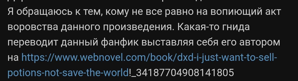 Я обращаюсь к тем, кому не все равно на вопиющий акт воровства данного произведения. Какая-то гнида переводит данный фанфик выставляя себя его автором на https://www.webnovel.com/book/dxd-i-just-want-to-sell-potions-not-save-the-world!_34187704908141805