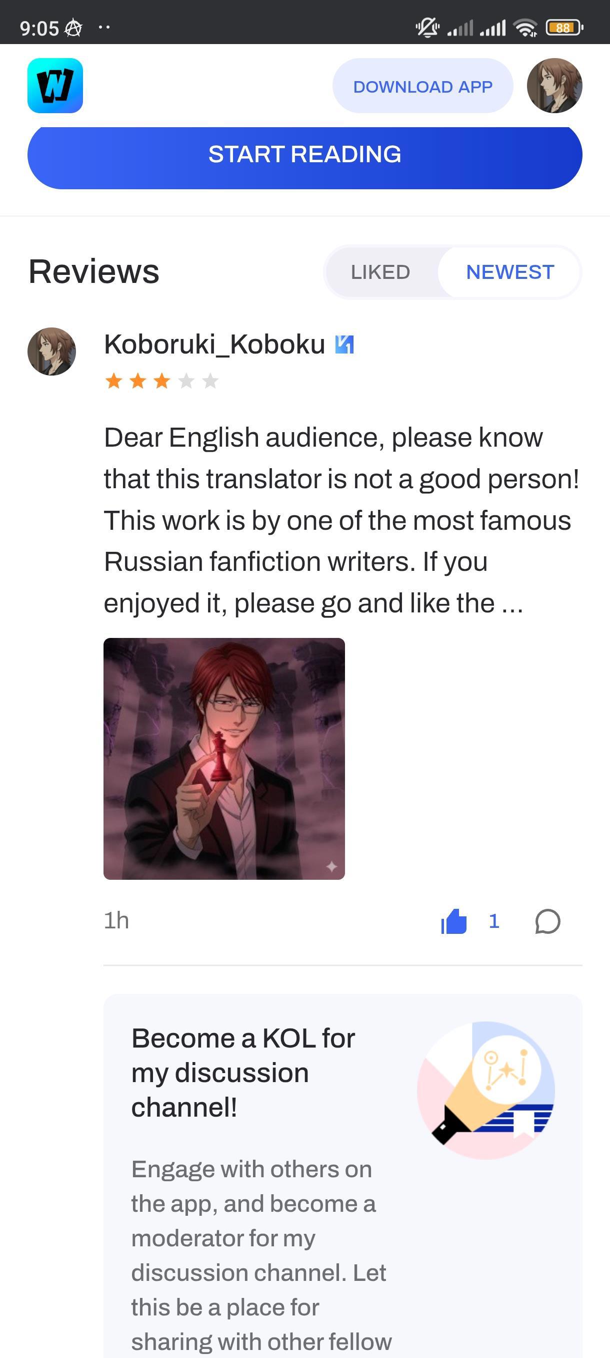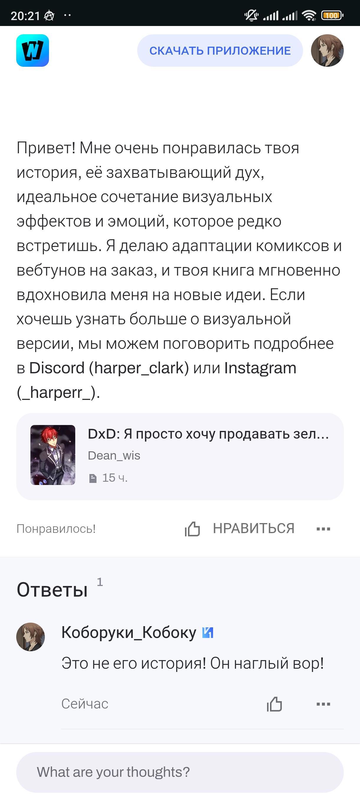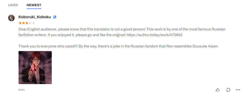 Какая-то гнида, стала переводить этот фанфик на английский называя себя автором. Вот почитайте: https://author.today/work/472642?c=36318995&th=36318995