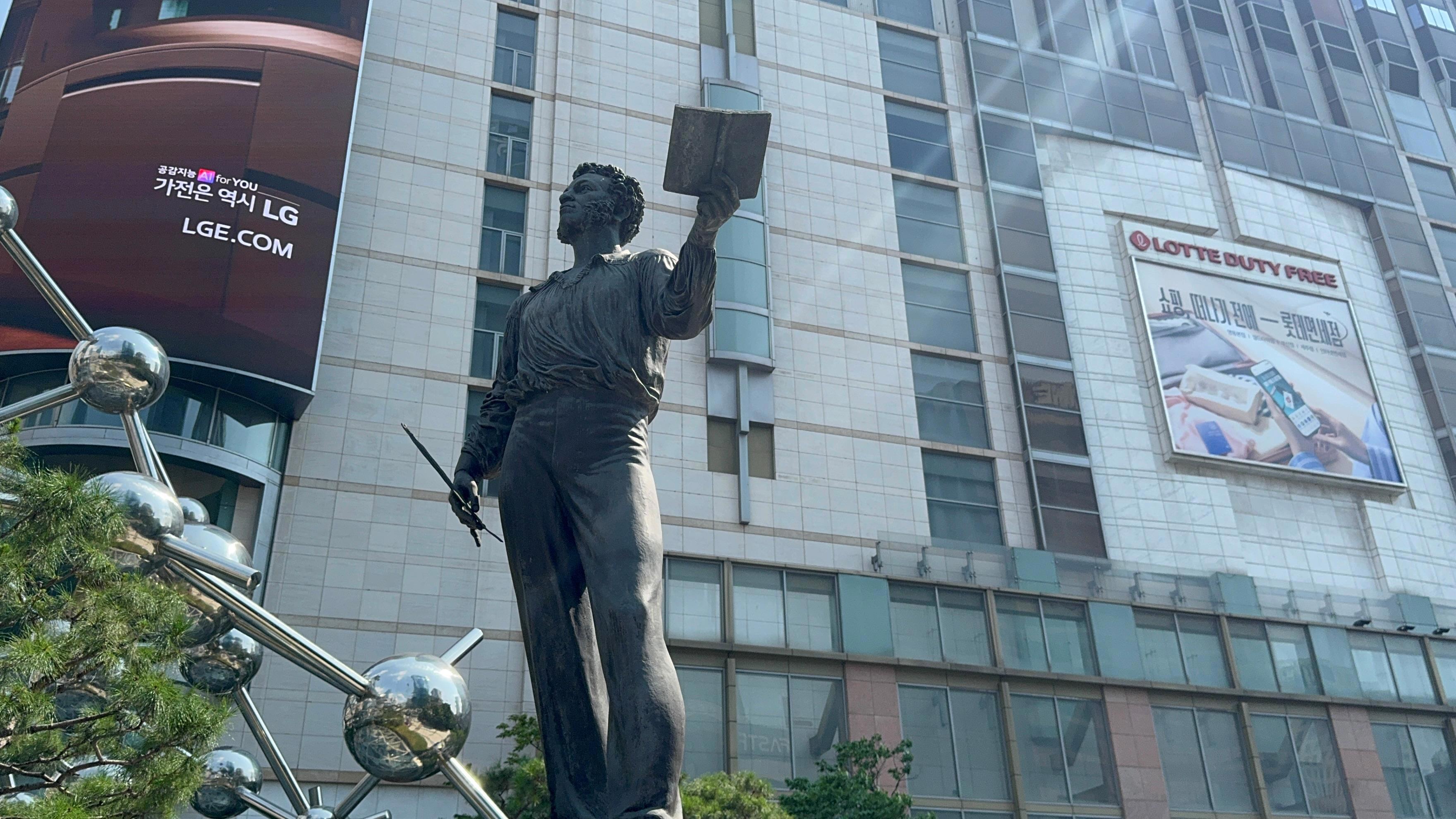 Главы про «Мастера и Маргариту» напомнили: в августе моя семья впервые побывала в этой прекрасной стране, и в Сеуле мы случайно наткнулись на памятник Пушкину возле отеля «Лотте»: