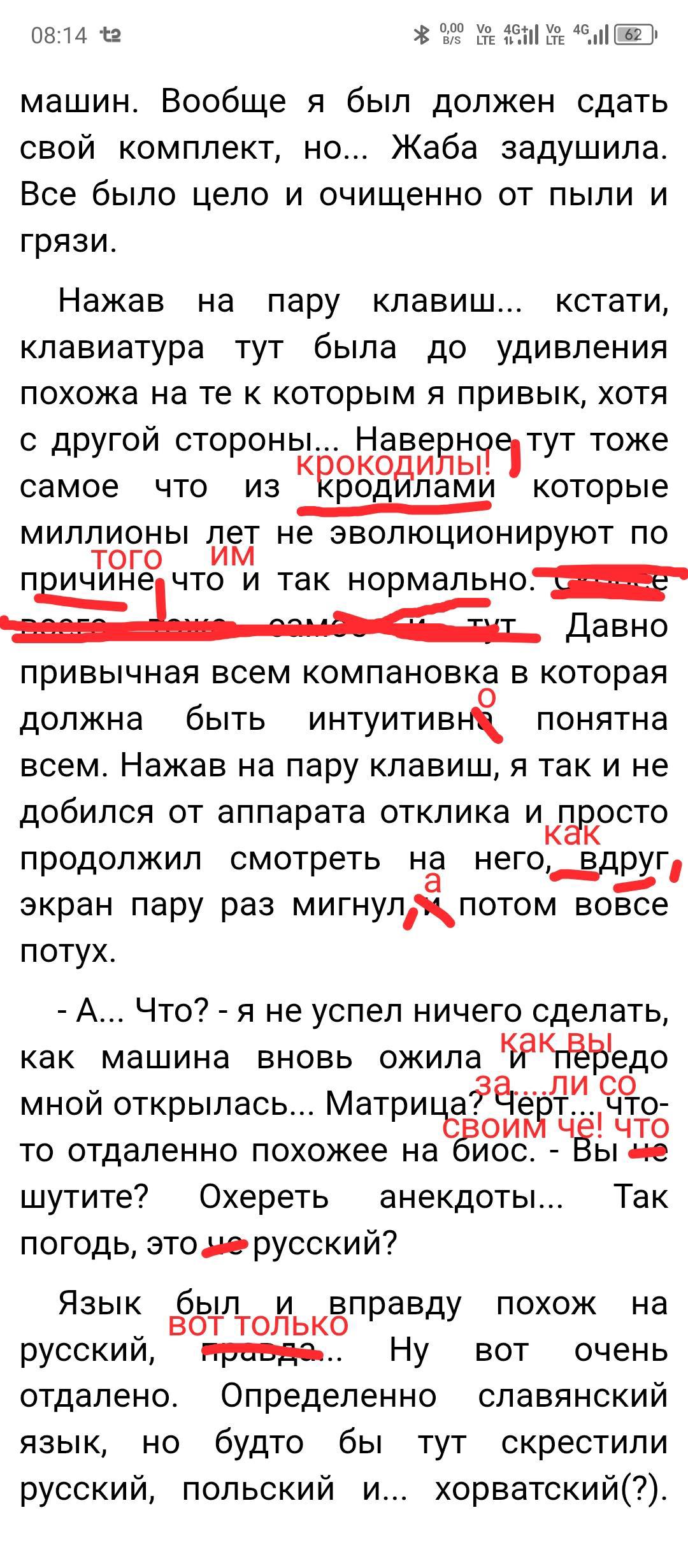 Учитывай и то, что я занимаюсь редактурой в свободное время... После восьми часов работы за компьютером, где разглядываю циферки и буковки. Так что некоторые ошибки вижу уже постфактум. Но все равно разница в редактированном тексте и оригинальном огромная.