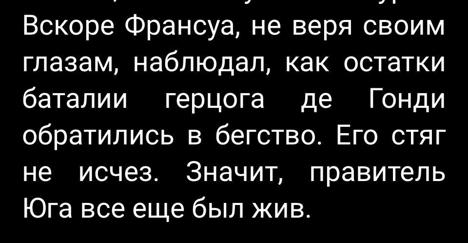 Да какие там львы?) Войска Бофремона и де Гонди уверенны в своих силах, как были уверенны всадники, проигравшие пехоте. Раз уж сами герцоги их приставили к принцу- победа 100%. Плюс следует учитывать, что они ждут подкрепления от Макса. Они ведь думают что маркиз де Гонди сказал дерзкому выскочке «вперед, возьмем Золотого льва в клещи» и Макс сразу погнал всю свою армию на помощь. Уверен, что герцог Бофремон и без компромата на Верену скоро вступит с Максом в финальную битву. Не слушает доверенного, воюет исключительно под королевскими знаменами, оставит Филиппа и ко 1 на 1 с Рикардо де Лоренцо + (это пока прогноз) может вылечить короля, тем самым отстранив его от трона еще на длительный срок.