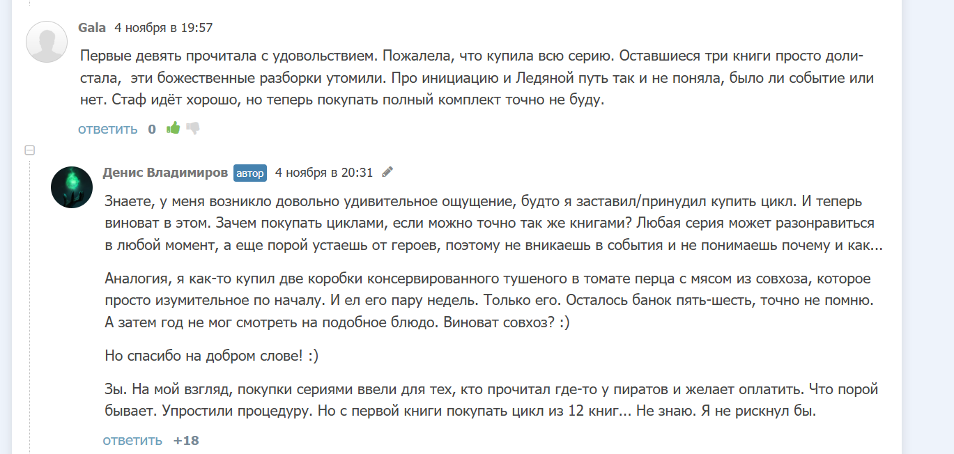 Здравствуйте. Я не рекомендую покупать мои книги циклами сразу. Из переписки на скрине будет понятно почему.