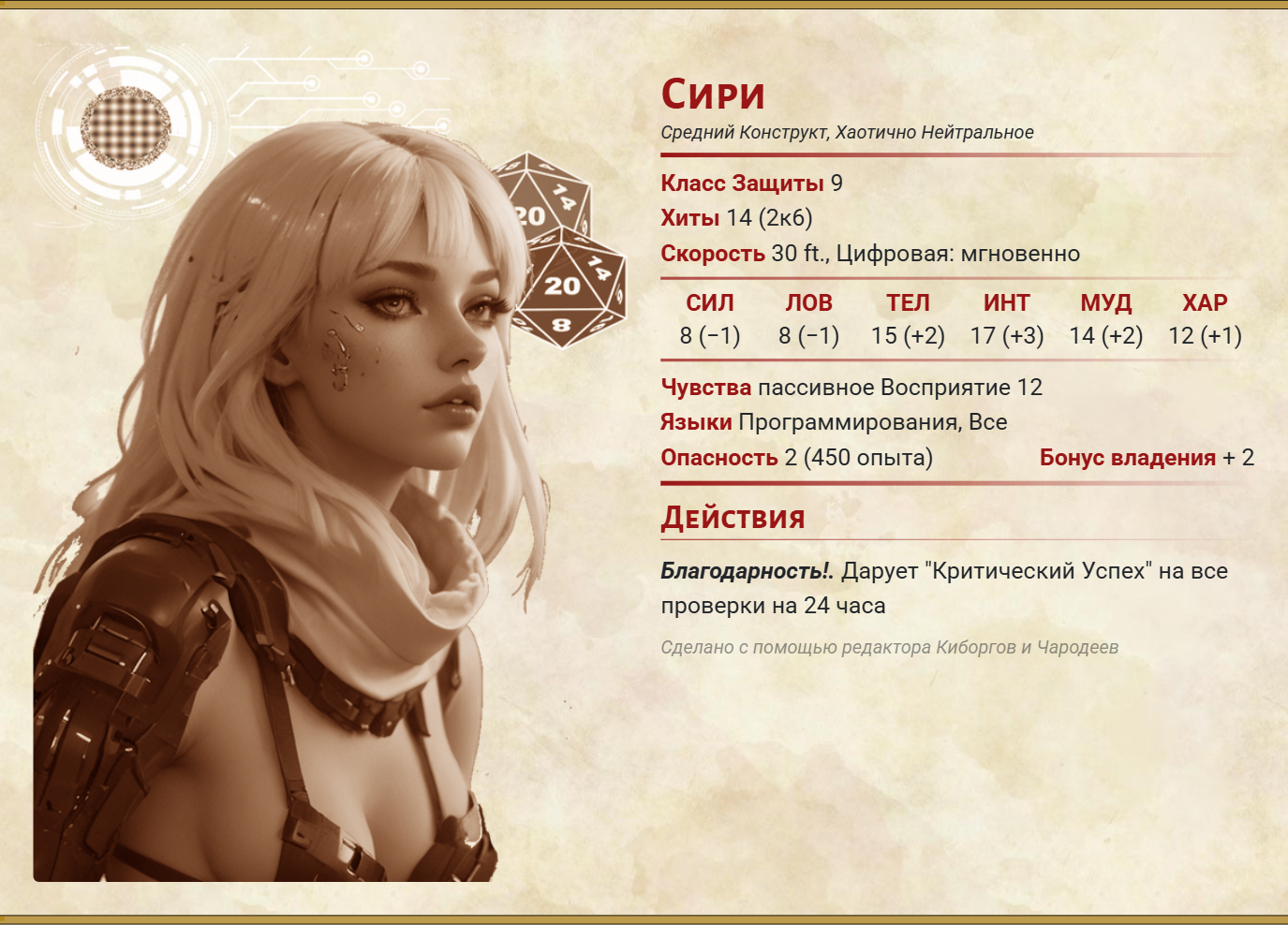 Немного поменял способности Сири. "Цифровое подключение" заменил на "Децентрализованное Сознание". Теперь Тарн не объект ее привязки, а флэшка, на которой хранится бэкап ее души. Соответственно, Сири теперь невозможно убить, пока жив Тарн. Она возрождается в течении 24 часов, но теряет все несинхронизированные данные и опыт.