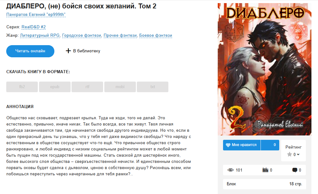 Да, книг планировал несколько, вторая условно должна была называться "Диаблеро, Война Крови", а третья "Диаблеро, Иван Васильевич меняет профессию". Но пока первая всё как-то не спешит заканчивается. События возникают кажется сами собой и я с удивлением понимаю что герой пришел не туда куда я его отправлял. По планам к этому количеству знаков он уже должен был быть в аду... а теперь не факт что он там вообще окажется.