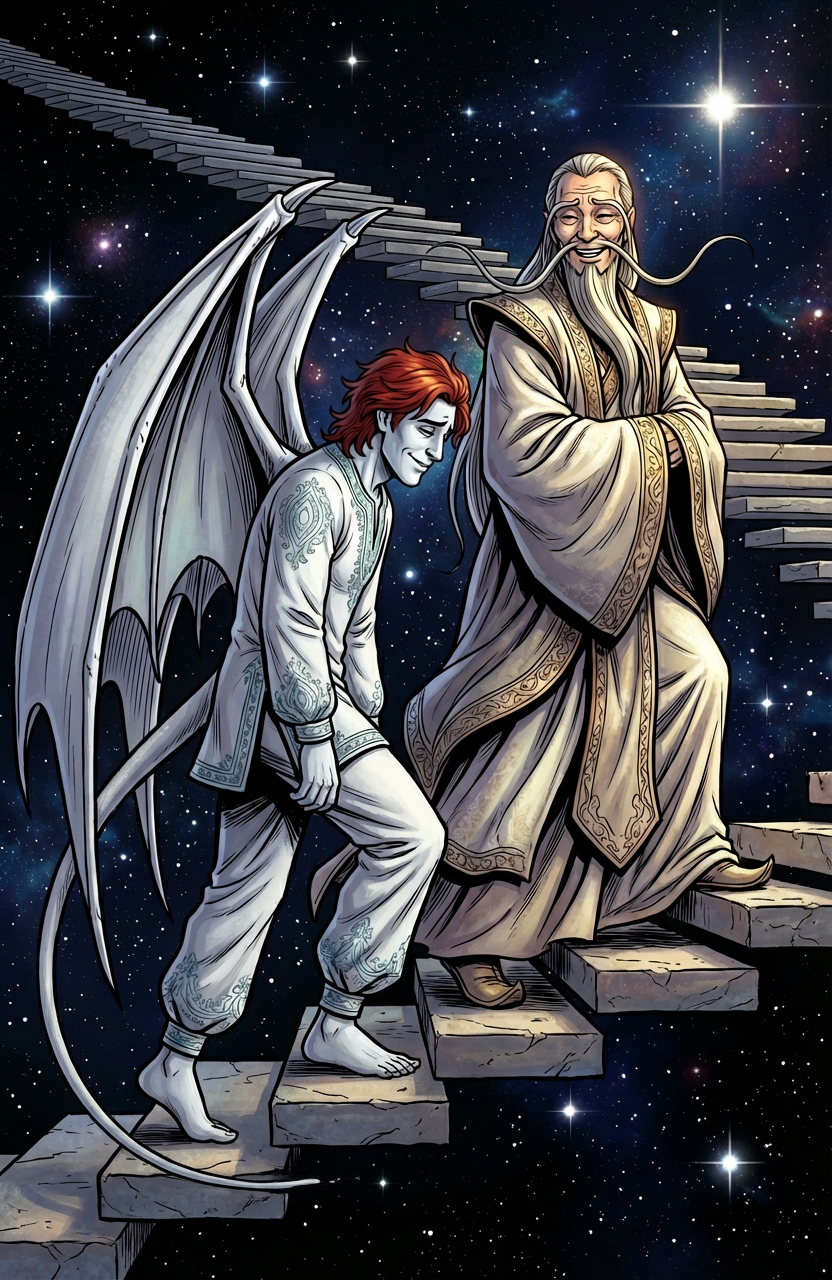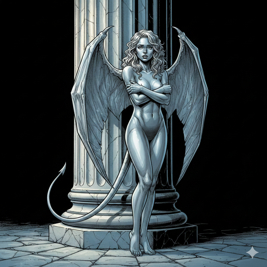 Там, в тени колонны, стояла переминающаяся с ноги на ногу бушучка в облике крылатой девушки. Она робко, с испугом смотрела на своего супруга, не совсем уверенная, как к нему относиться… теперь.