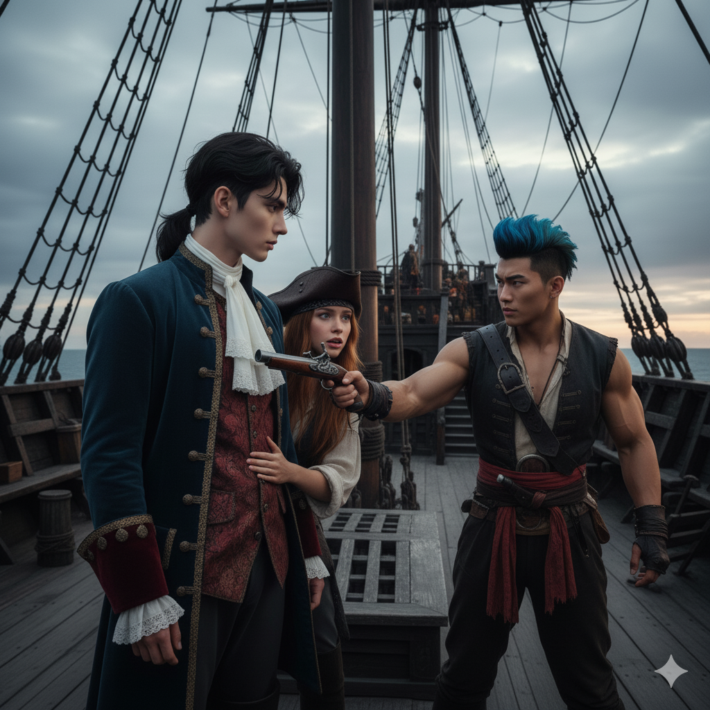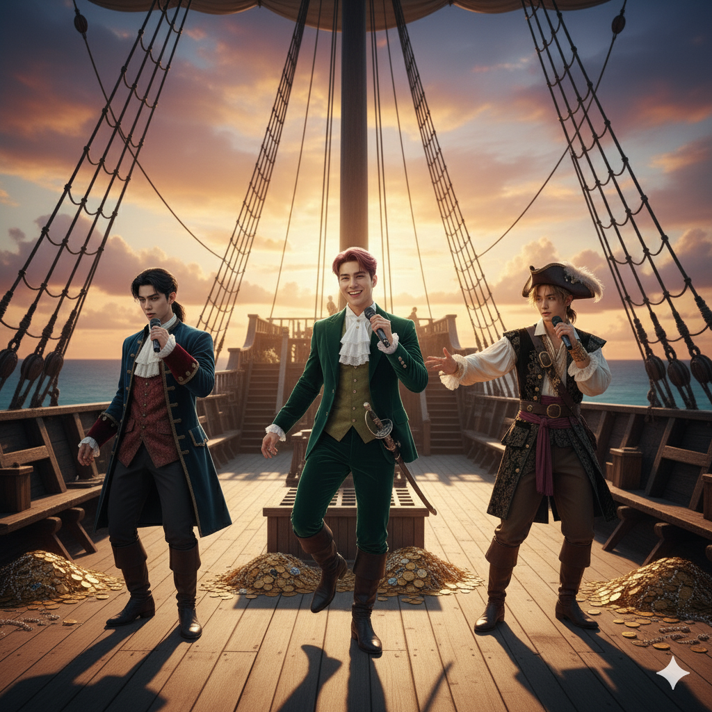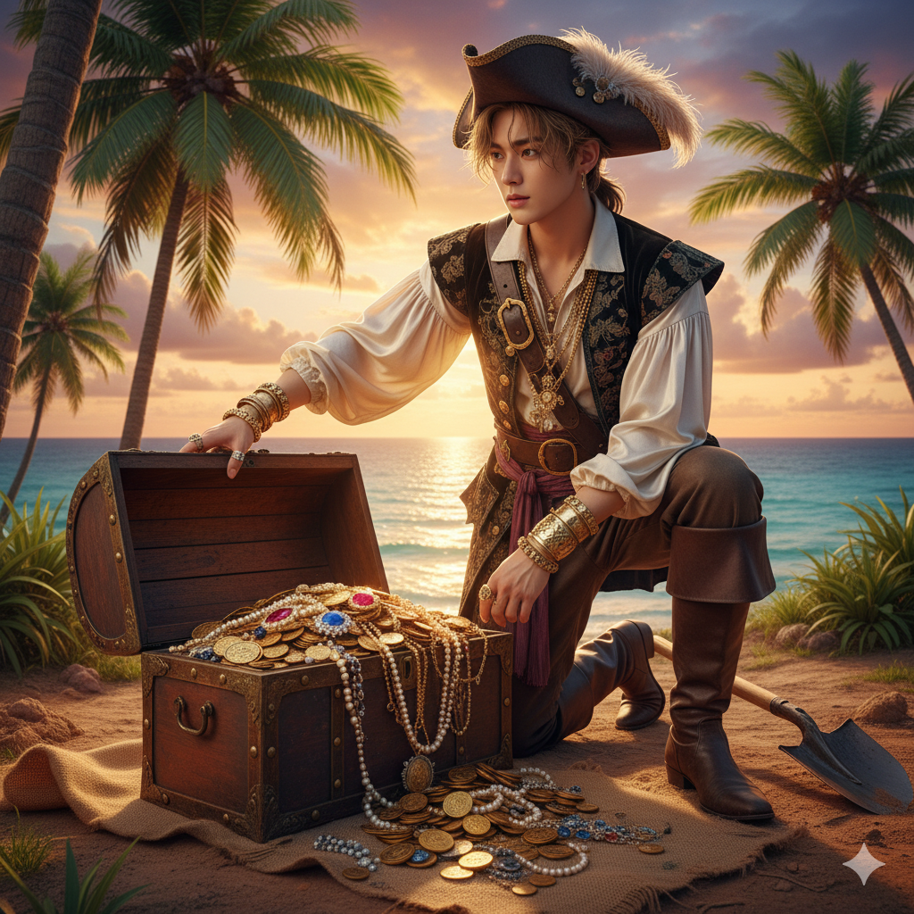 A late teen, handsome, korean. He has dark blond hair a lot of golden bracelets and golden necklaces. He is opening chest with golden coins like piastre and jewelry after diging a ground near palms. He is dressed like pirate of 17th century. Setting: Pirate movie.