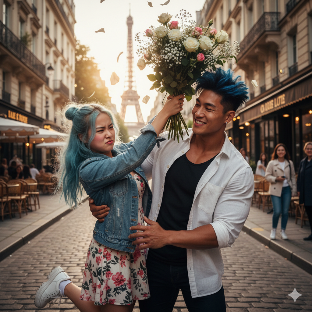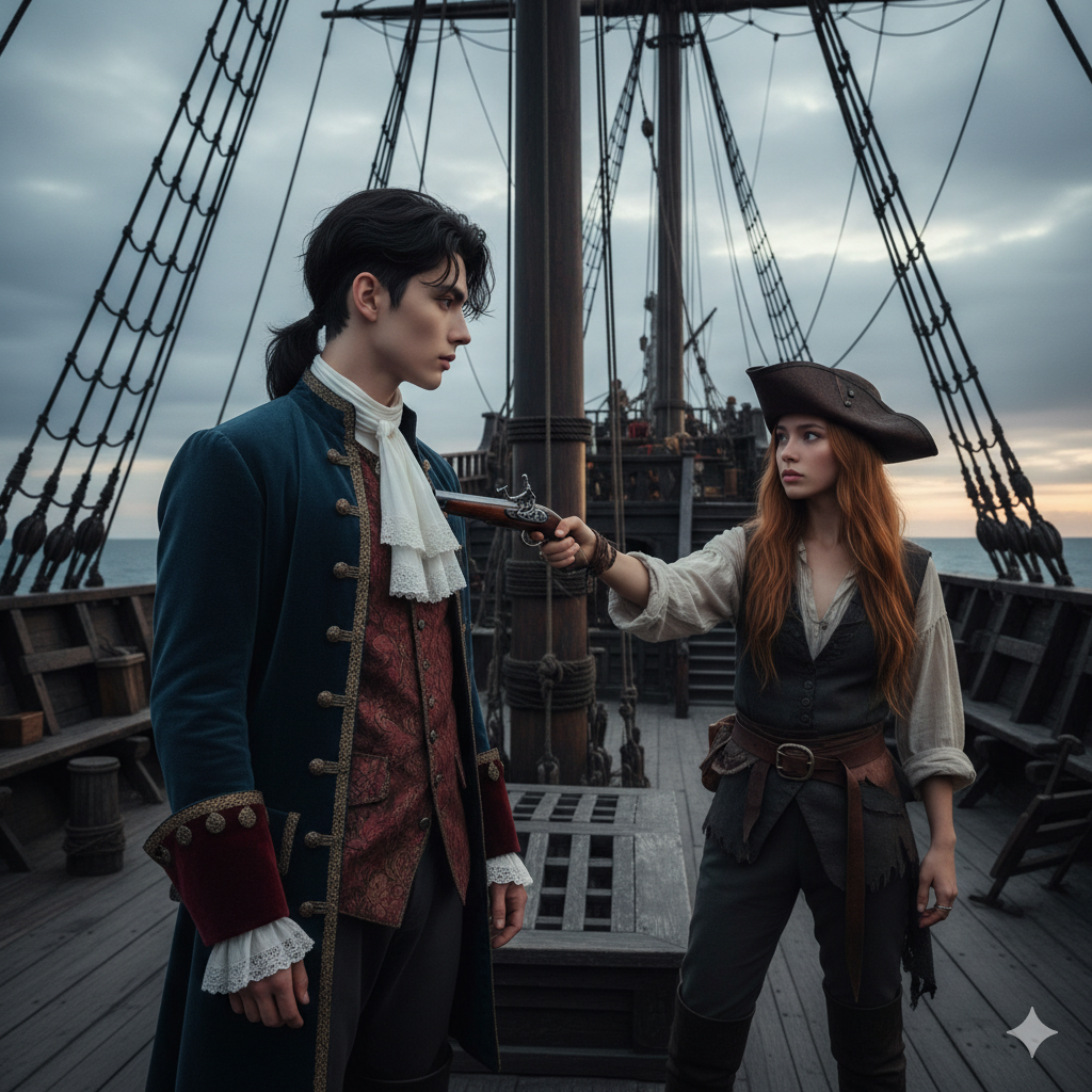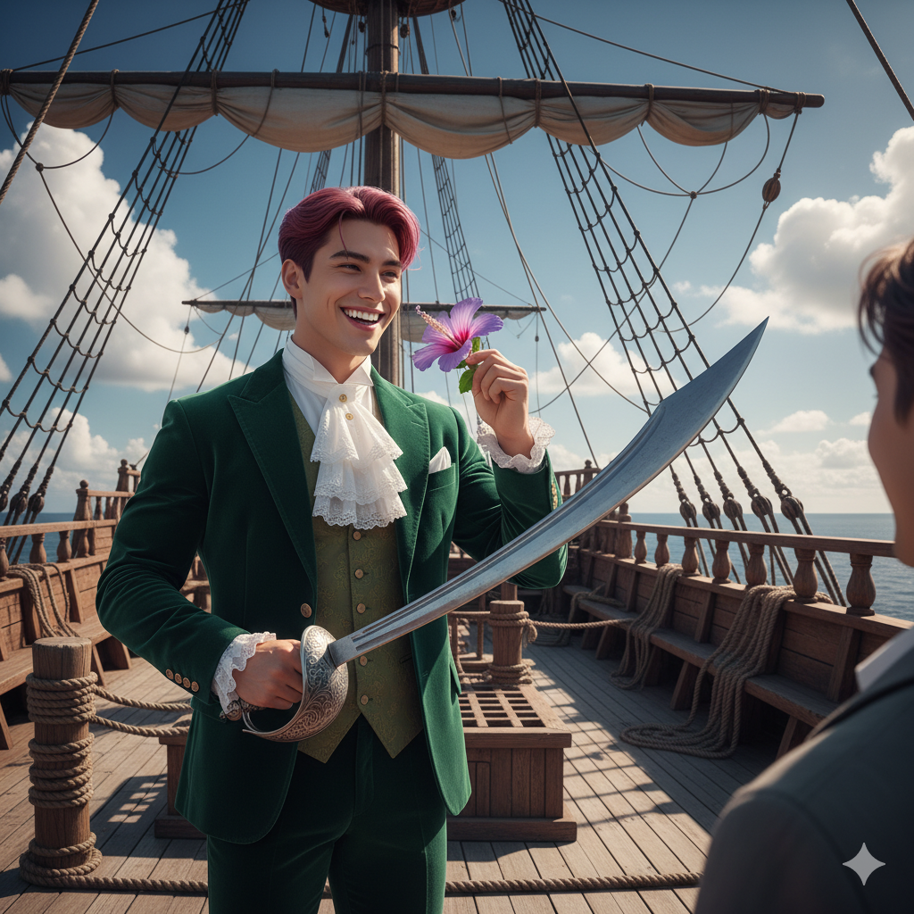 Character reassembles Dr. Livesey from soviet adaption of treasure island: green suite and enormous wide smile. He is a late teen athletic korean male with styled middle raspberry hair. Setting: galleon ship. He is fun but points out big steel falchion to someone and in another hand he is smelling some flower. Photorealism.
