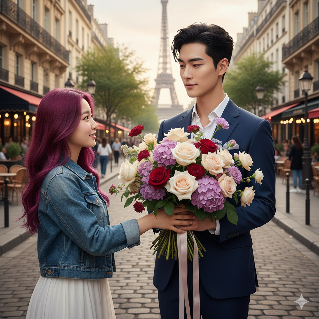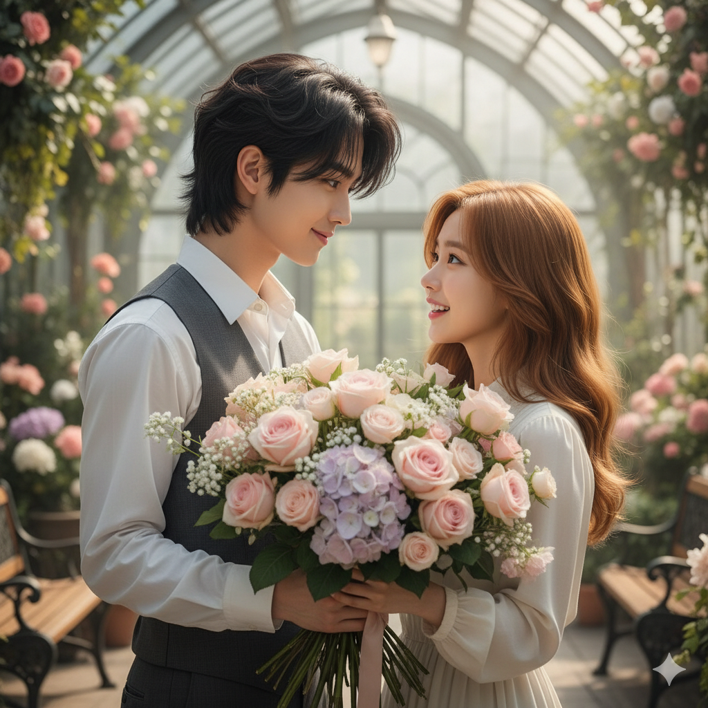 Для такой прелестной леди подойдет только такой роскошный букет: гортензии оттенят изумительный цвет волос и хотя белые розы шикарны они не сравнятся с вашим цветом кожи, надеюсь Вы примите мое сердце как приложение к букету?
