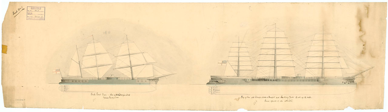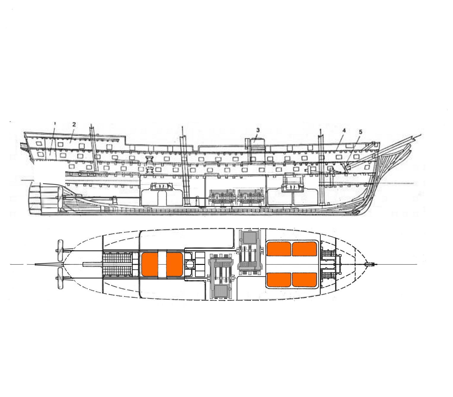 Две машины по 600 нар л.сил, скорость под машинами 12-13 узлов. броня сплошная по кругу, борт -5 дюймов, оконечности 4-е дюйма, собрана из броневых плит толщиной один дюйм.