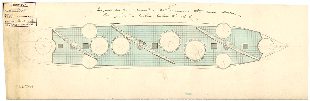Вооружение первоначальное: на гондеке —34 × 8-дм/65 cwt пушек с Аганемнона, на баке 2- 60 фунт нарезных Баумгарда, на шканцах и верхней палубе 2×60 фунт нарезных Баумгарда, и противоминные 10 × 24 фунт коранад. На марсах 4-е митральезы.