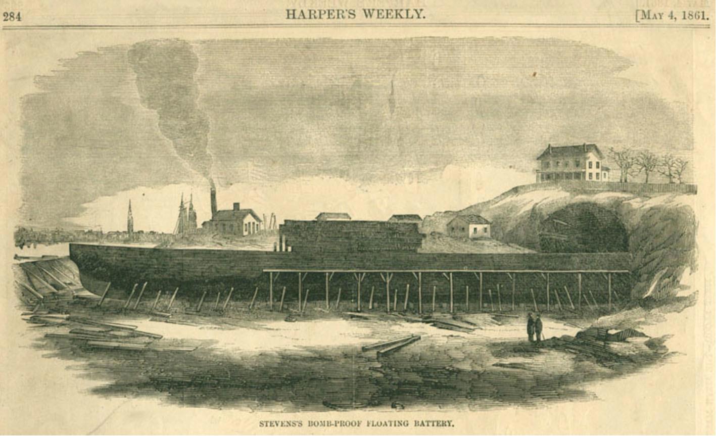 Эта история началась в 1841 году, когда во время очередного обострения американо-британских отношений Конгресс Соединённых Штатов принял решение о выделении новых средств на строительство флота. 13 августа сыновья полковника Стивенса Роберт и Эдвин предложили военно-морскому департаменту построить для обороны морских подходов к Нью-Йорку паровое железное судно. По замыслу изобретателей, судно должно было воплотить все последние достижения техники: оно оснащалось тяжёлыми бомбическими орудиями и гребным винтом, защищалось бронёй из склёпанных вместе железных пластин, а его машины должны были располагаться ниже ватерлинии для укрытия от вражеского огня.