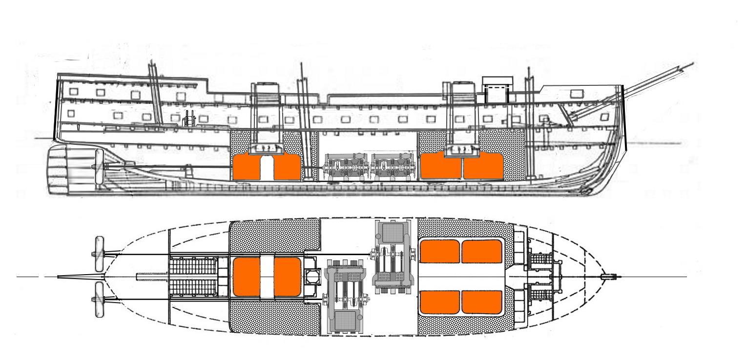 «Плавучая батарея» Стивенсов (слова «броненосец» тогда ещё не знали) должна была оснащаться паровой машиной в 900 л.с. Стивенсы полагали, что при заостренном веретенообразном корпусе такая машина сможет обеспечить кораблю огромную по тем временам скорость в 18 узлов.