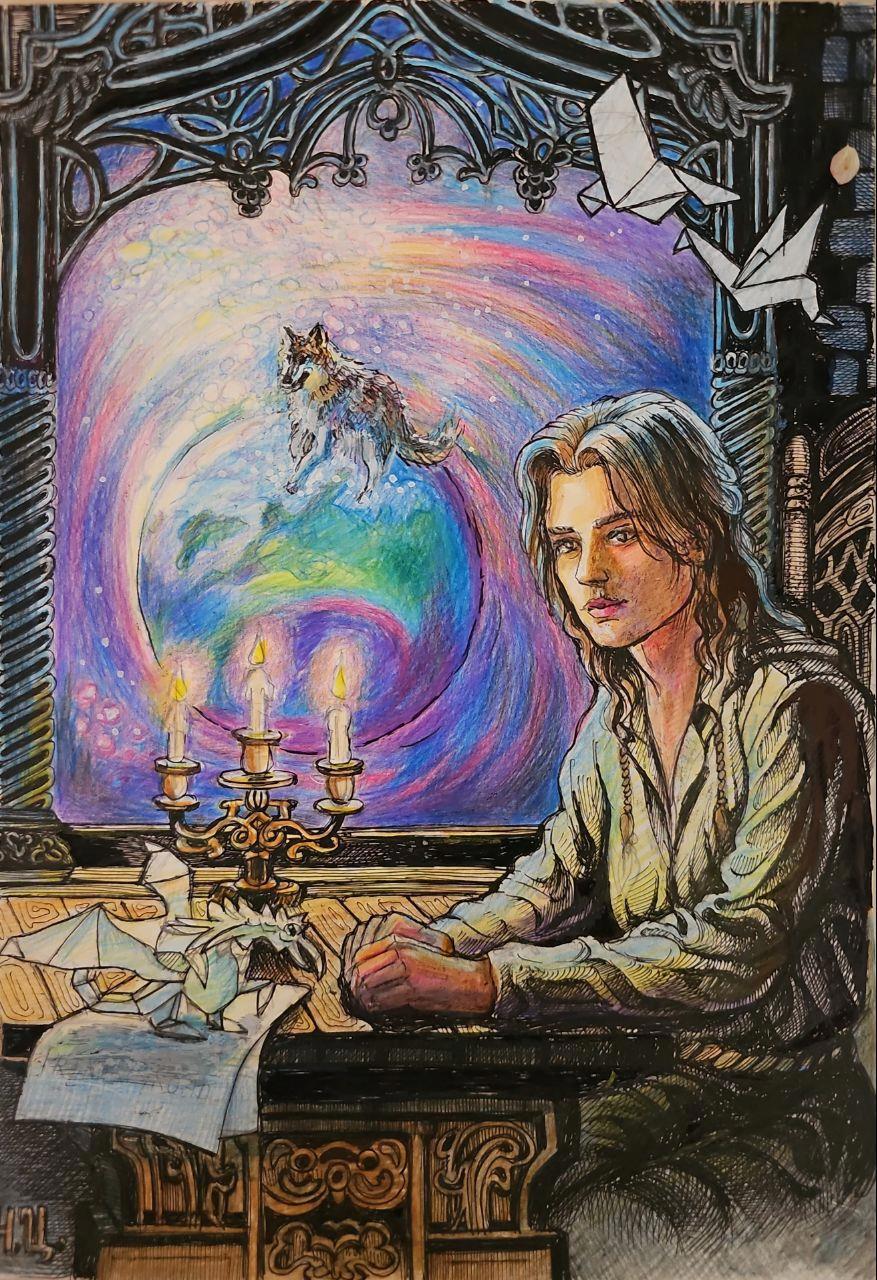 Моя первая сбывшаяся в 2026 маленькая мечта связана с этой историей 💙 Я часто думала о том, что очень хотела бы увидеть арты по героям "Дороги первоцветов" — и моя подруга нарисовала для меня эту прелесть, мастера оригами (а некоторые зовут его "Хозяином"), одного из самых загадочных персонажей. А еще и Роши, дух-пес, затесался. Арт восхитительный, я не устаю рассматривать его, подмечая детали! Делюсь и с вами!