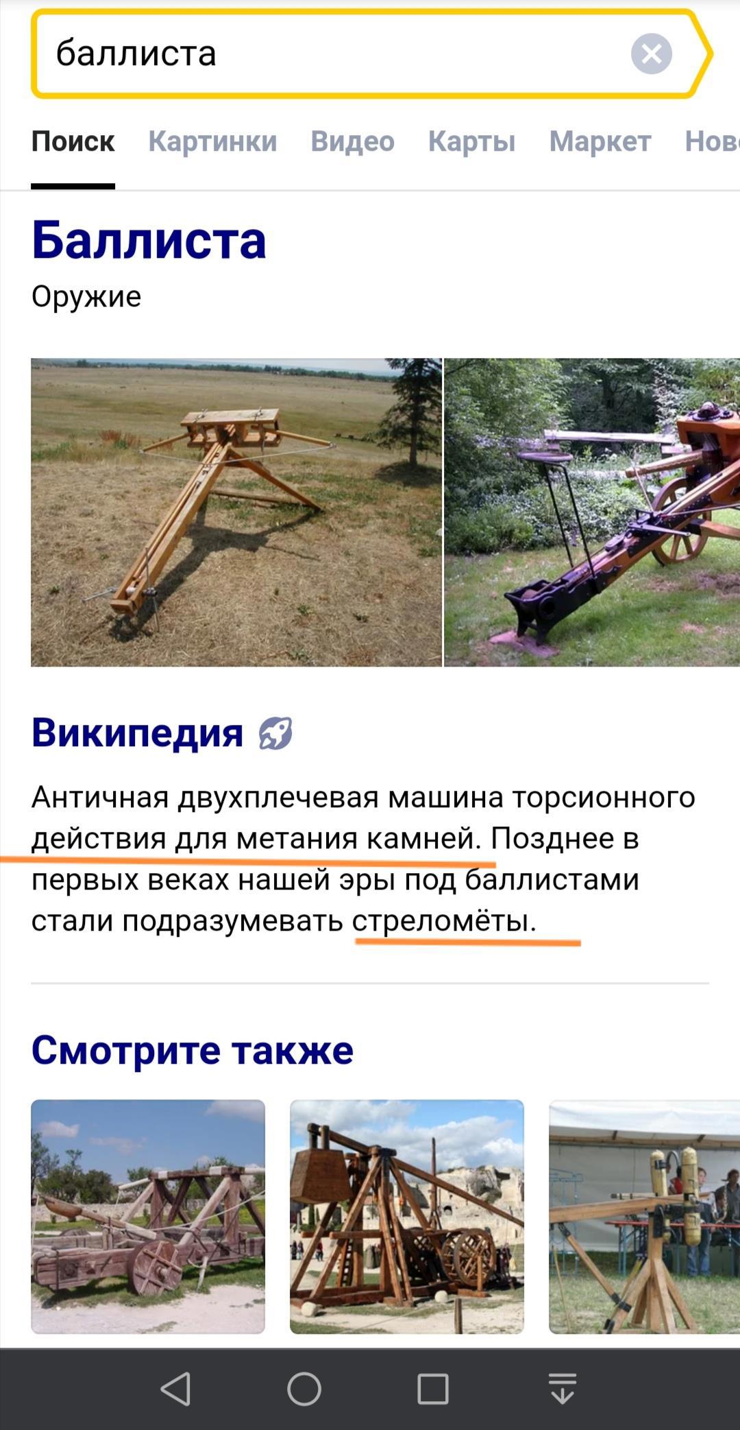 Когда читал про баллисты и катапульты, долго не мог понять, почему баллиста стреляет ядром а катапульта стрелой.Теперь знаю что баллиста стреляет не только стрелой, но и камнем.