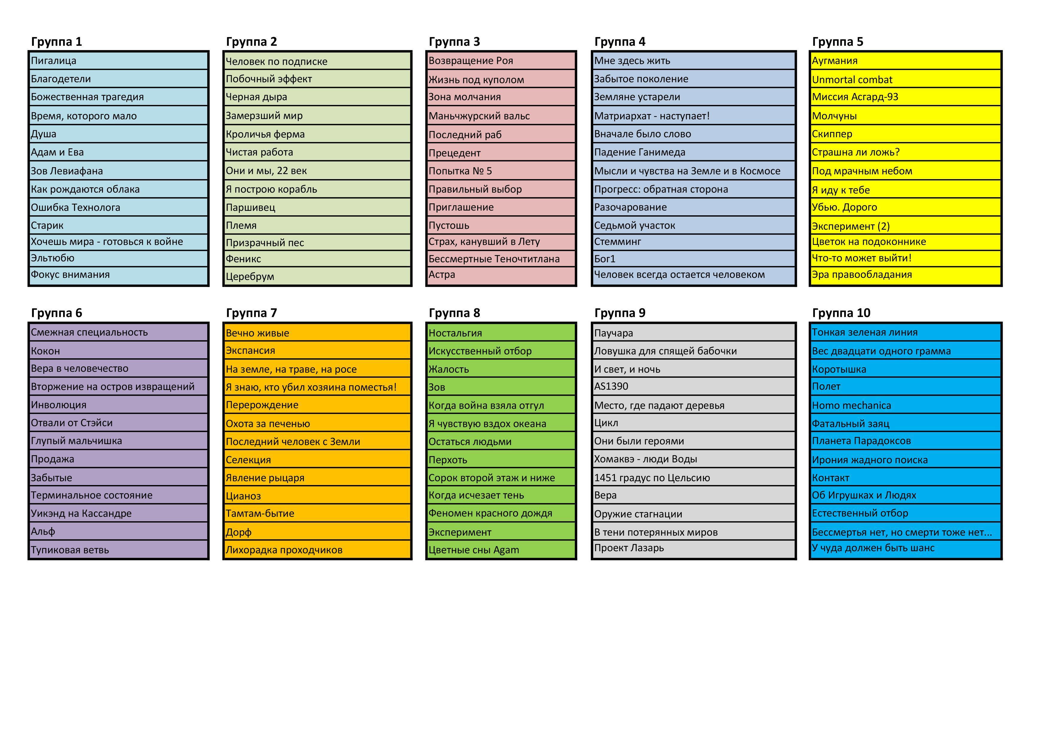 Разбивка рассказов по группам. Порядок расположения рассказов в группах строго произвольный.