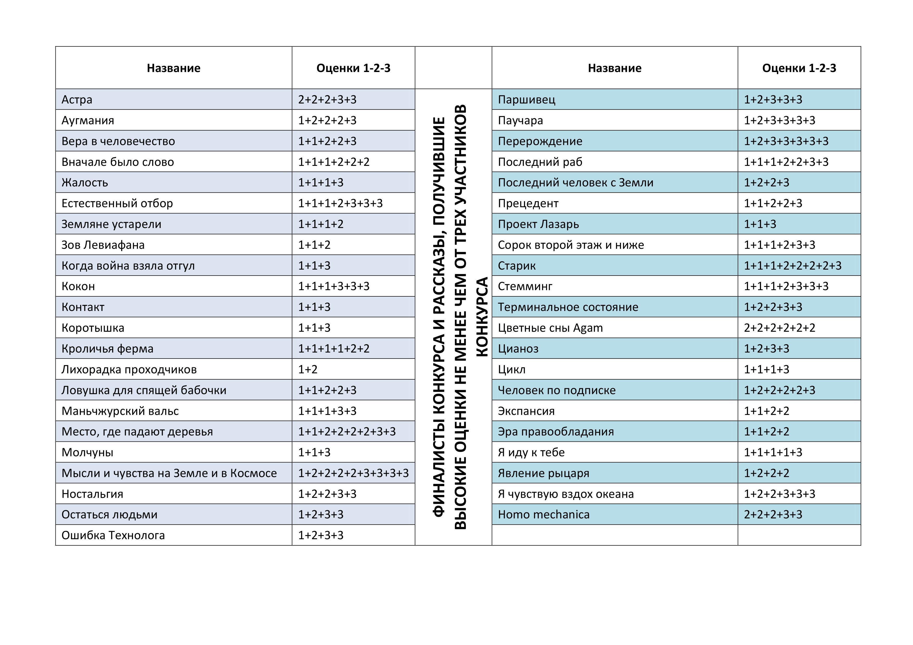 В подборку вошли 20 финалистов конкурса и рассказы, получившие следующие комбинации оценок (мест в группах) от трех и более участников конкурса: