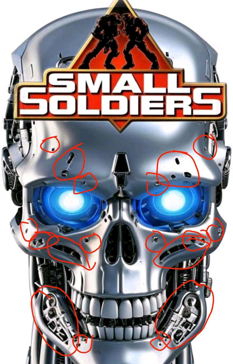 Даже беря твой арт, смотри на выделенное красным маркером, что это за устройства на нижней челюсти чем не импланты, а микро отверстия внутрь черепа, нет, понятно что киноделы и те кто рисует для антуражу лепят, но в машине не будет ничего лишнего(как и в организме людей и млекопитающих кстати:)), будь это в реале, либо для скрытности, либо для эффективности либо для надёжности, импланты могут и группой быть размещены, сбоков для контроля тканей тела, а для мышц лица, спереди самого черепа.