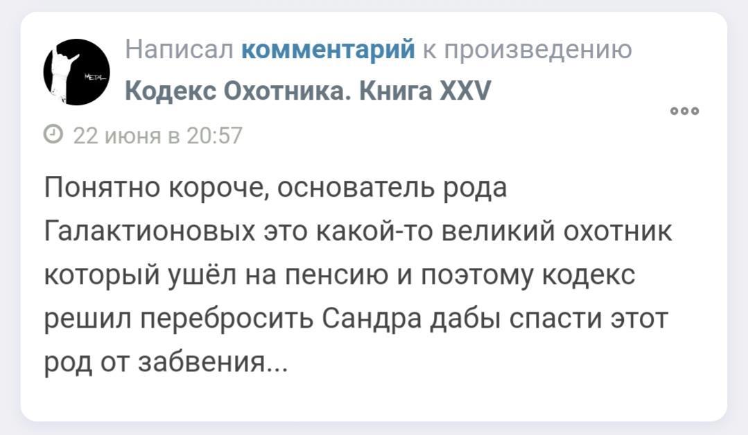 Написал комментарий к произведению Кодекс Охотника. Книга XXV