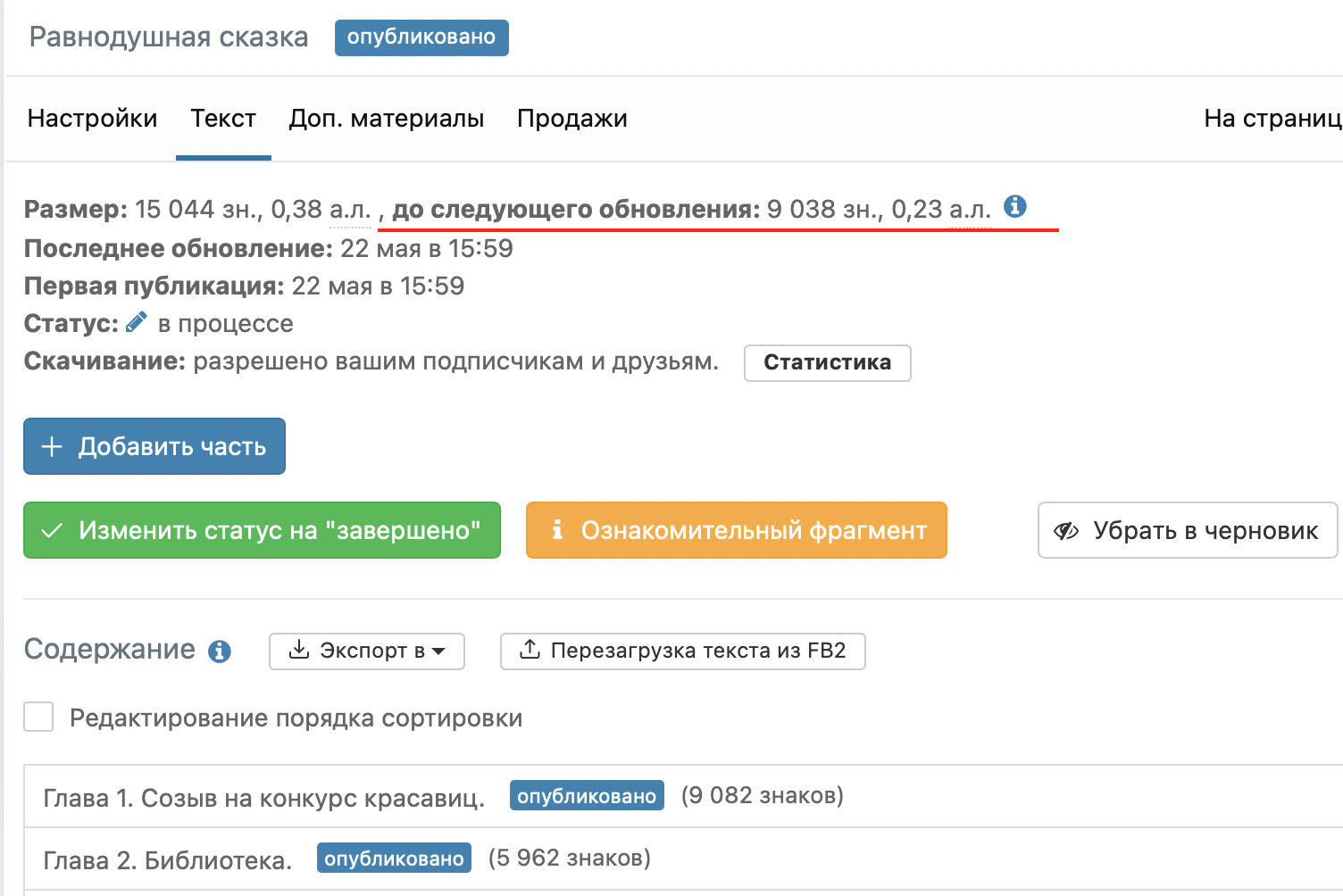 Просто для примера: мне до следующего обновления (что бы попасть в последние обновления) нужно ещё 9к знаков написать в моей книжке.