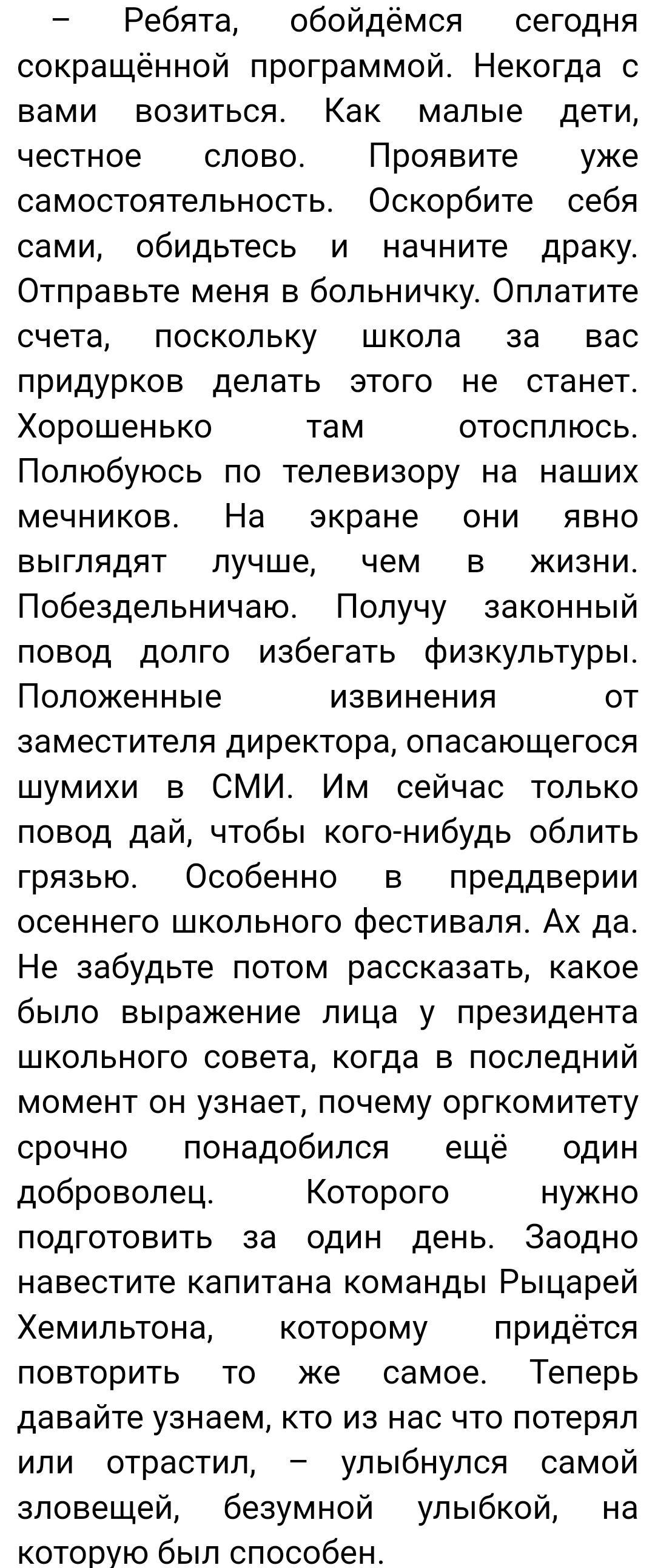 Написано вроде неплохо, но какого хрена происходит с диалогами? Почему они такие длинные? Это уже скорее монологи, потому что когда персонаж растягивает свою речь на страницу текста без каких-либо видимых причин это просто ломает все погружение.