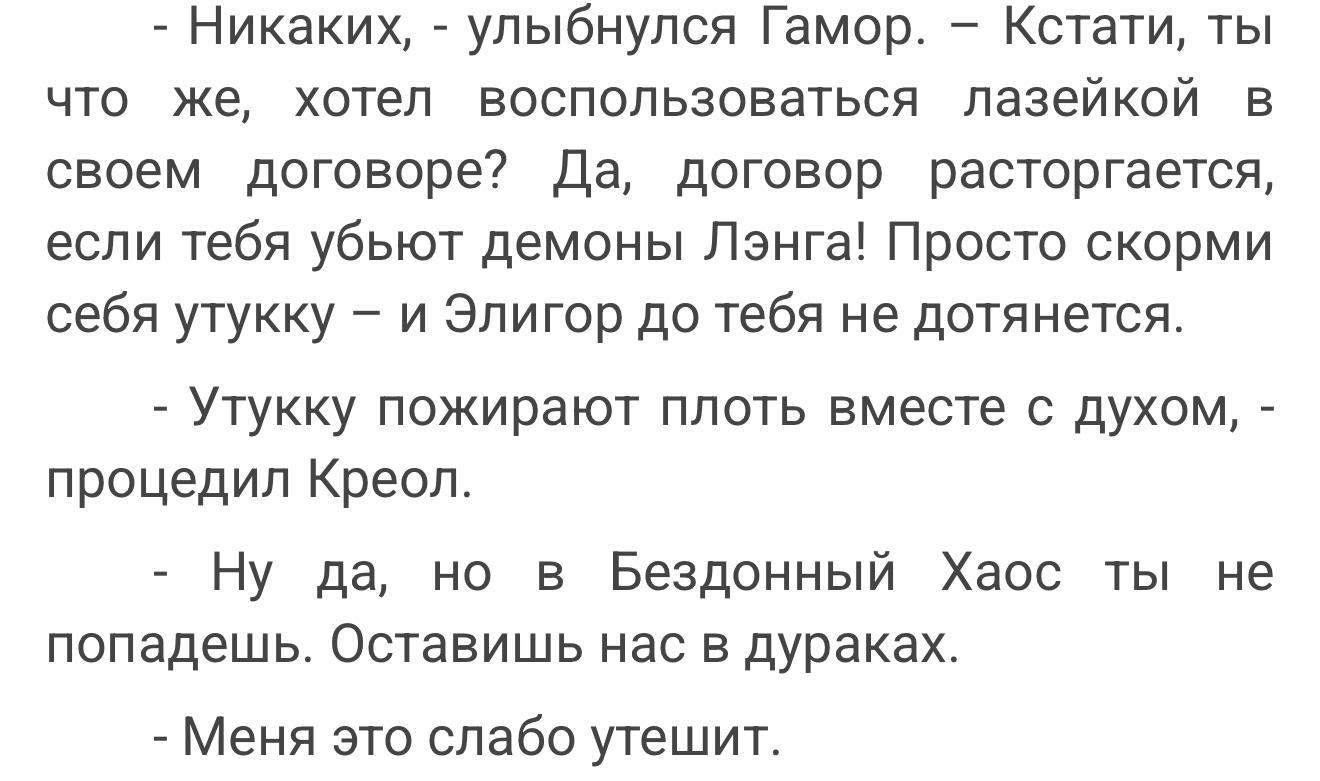 «— А по-моему, хорошая шутка, — пожал плечами Креол. — Смешно. Мы так, помню, на гулей охотились — собрали сотню стрелков, вооружили серебряными стрелами, посадили их на деревья, а я ка-ак превращу всю воду в кровь! Целое озеро крови! Со всей пустыни на запах сбежались, стрелки их и постреляли… да и я с полсотни спалил… Император, когда узнал, так смеялся… даже все казни перенес на другой день — ради праздника.