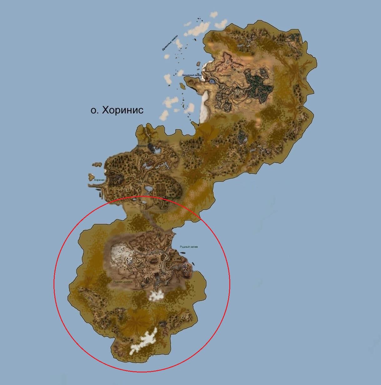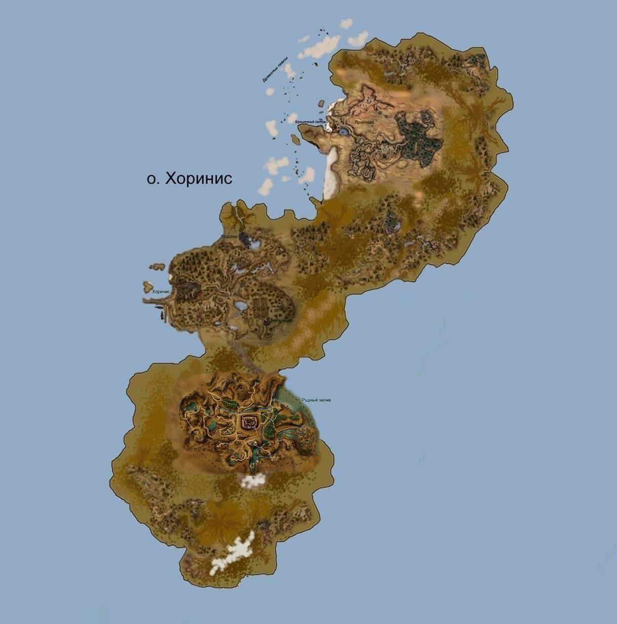 Поправил найденную в нете карту Хориниса в соответствии с указанными замечаниями и убрал ледник, что был нарисован рядом с засушливым севером, перенёс его на юг, не зря именно там столько воды в рудниковой долине.