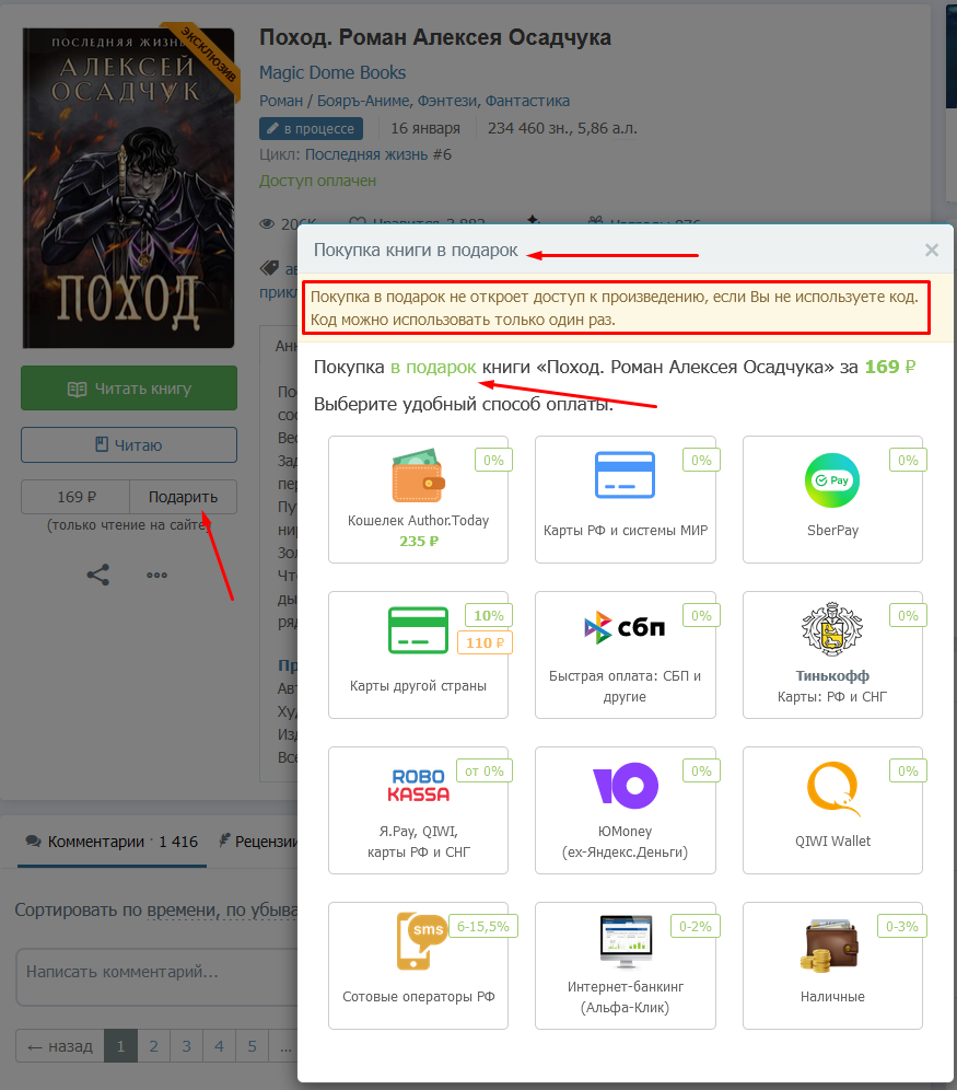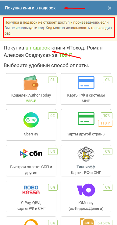 Посмотрите у себя в списке заказов. Если деньги сняли, значит заказ оплачен и код рядом с заказом https://author.today/account/orders