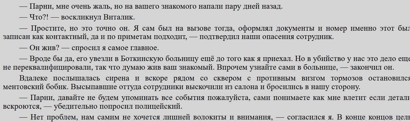 я понял, что вы имеете в виду. Некоторые места мне самому не нравятся, не везде удалось соблюсти баланс между точностью и художественностью. Увы мне.