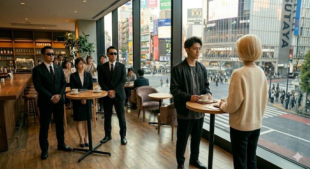Недалеко от «парочки» тусуются два телохранителя и ЁнЭ с Харуко, создавая толпу и вызывая заинтересованные взгляды персонала кафе и посетителей.