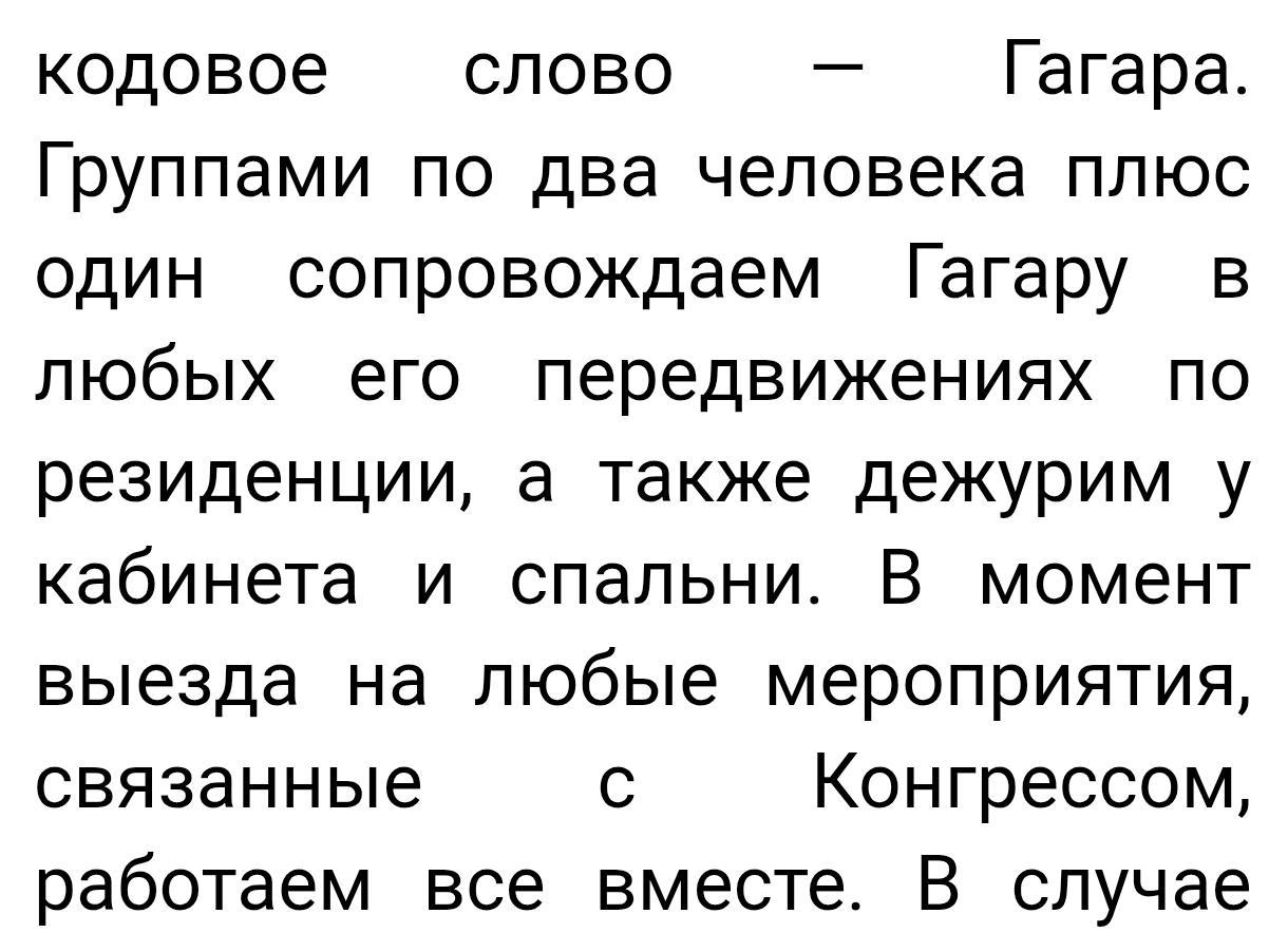 Я не понимаю что происходит. Объясните мне, почему Ард стоит на охране периметра, когда у него задача сопровождать Гагару даже при передвижении по резиденции? Причем от начала до конца съезда.