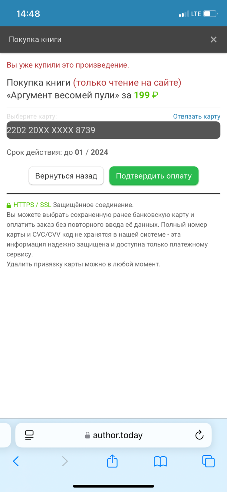 Здравствуйте, после оплаты не исчезла возможность купить книгу. И читать дальше невозможно