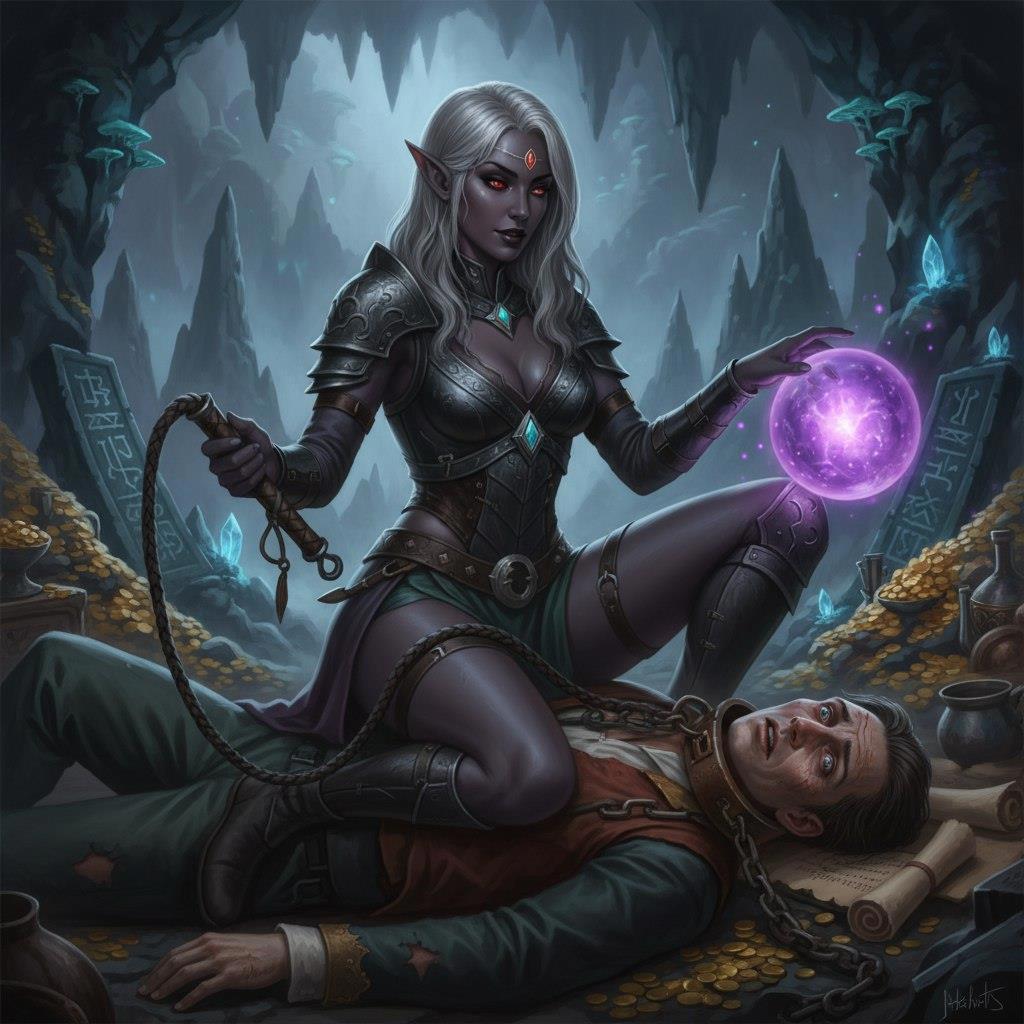 Причем будет темная эльфийка,верхом на Мрадише,а униженный Мрадиш при встрече с ануфри ввернет,что ему все равно лучше чем быть ее адептом и потому что ритуал порушился из за ее косорукости и ТД.)