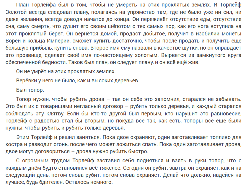 Автор тут попал на крупные литературные всеросийские семинары в Химках, где ему оплачивают проживание, питание и дорогу, и потому пока немного отвлекся. Но уже скоро регулярные публикации вернутся, и думаю к концу ноября книга будет полностью выложена. Там потом вычитать еще, поправить, подпилить, заточить - и прям вообще хорошо будет. Но этап допиливания он у автора всегда такой больше, для эстетов, сюжетных изменений не будет.