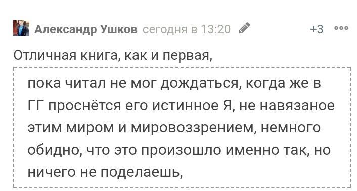 Автор, сам понимаешь, народ не привык ставить лайки, если никто не просит, а книга, даже серия книг, просто лучшее, что я читал, смотрел, увидел, когда-либо в жизни, думаю, я не один такой, ехал в метро, читал и подавлял истерику, такое сочетание серьёзности и юмора просто топчик, так что, не расстраивайся, всё будет, держи наградку