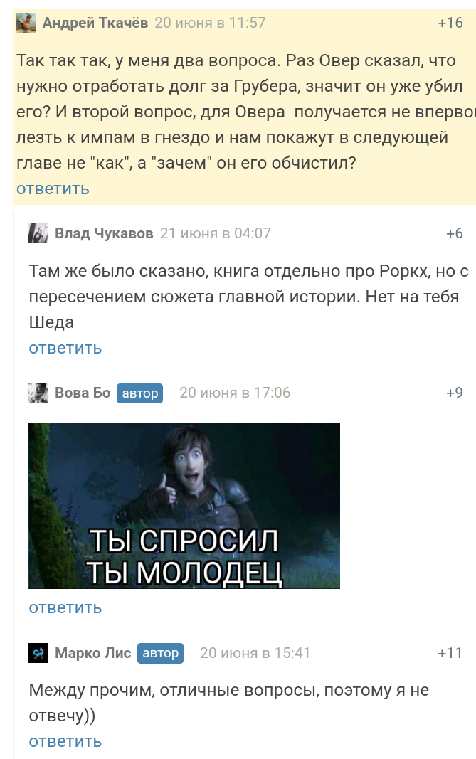 Я два года не читал книги, а ведь раньше прочитывал по одной в неделю. Как.де я рад что снова погрузился в ЛитРПГ, начиная именно с вашего произведения. В целом, другие читатели уже все высказали и я с ними полностью согласен. Единственное, мне не хватило описания утеса, там происходили основные события и мне тяжело приходилось представлять расположения зданий, а также самого утеса. Как он выглядит? Есть ли рисунок? Было бы здорово его увидеть, так гораздо легче было бы запоминать и погружаться в поселение