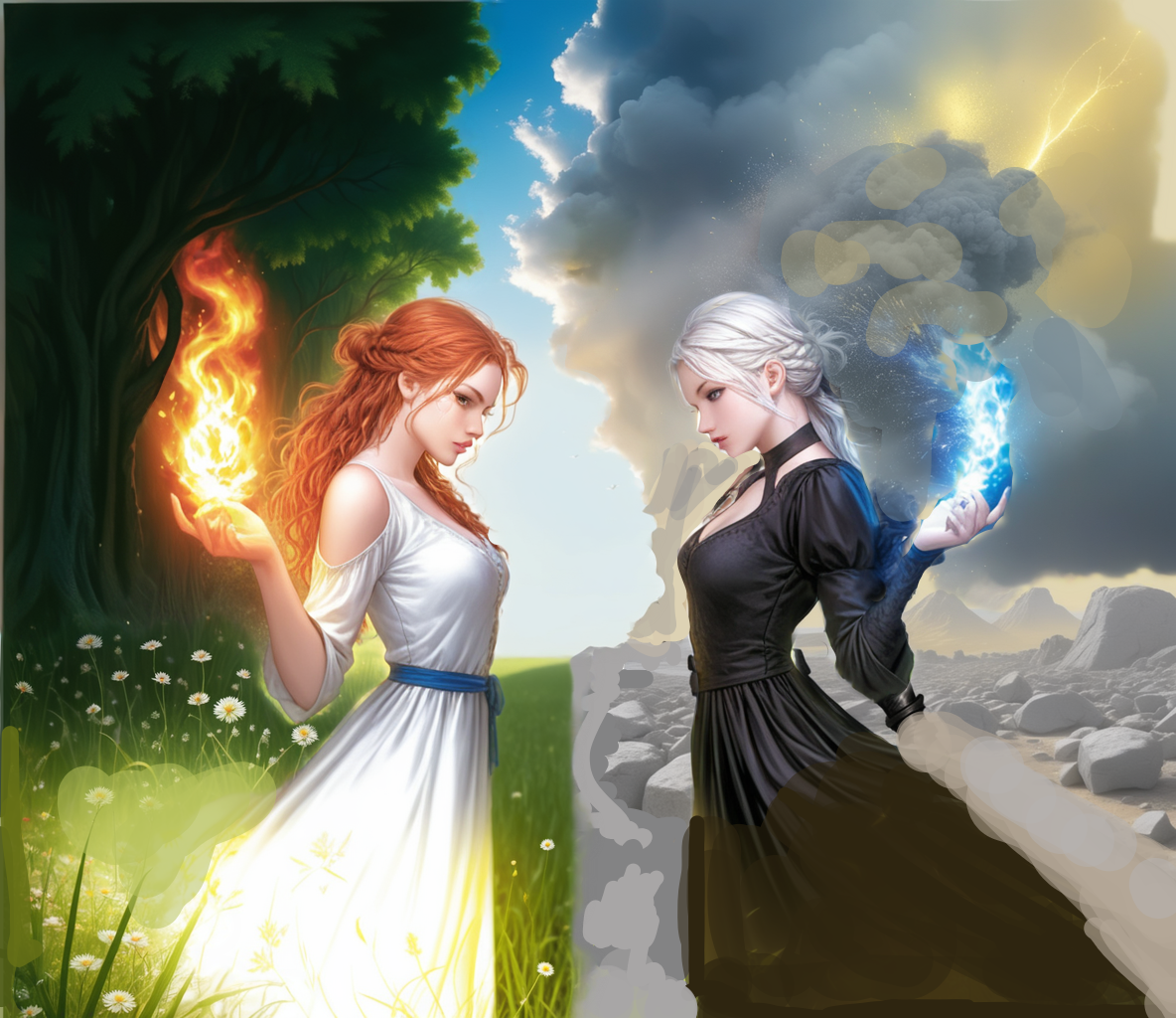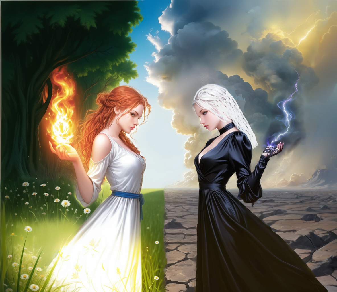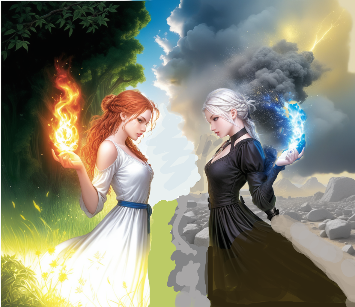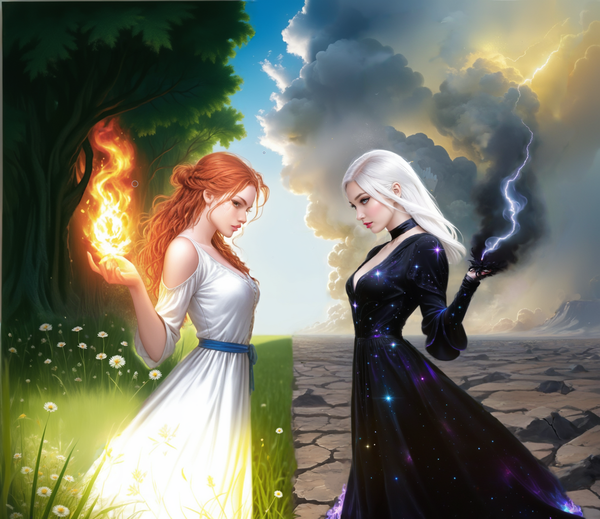 Главная героиня - девочка-жизнь, 19-21 год, яркая, шебутная, растрепанные рыжие волосы, зеленые глаза, веснушки. Целительница (по желанию, можно отразить в одежде или нарисовать золотой медальон). Теплые оттенки.
