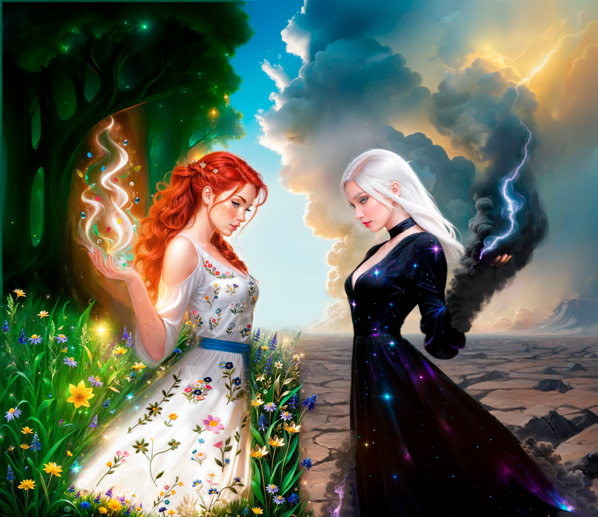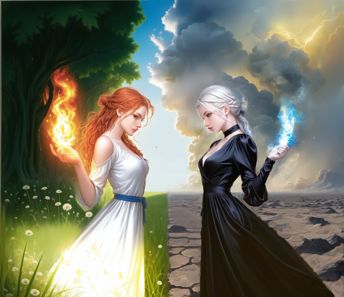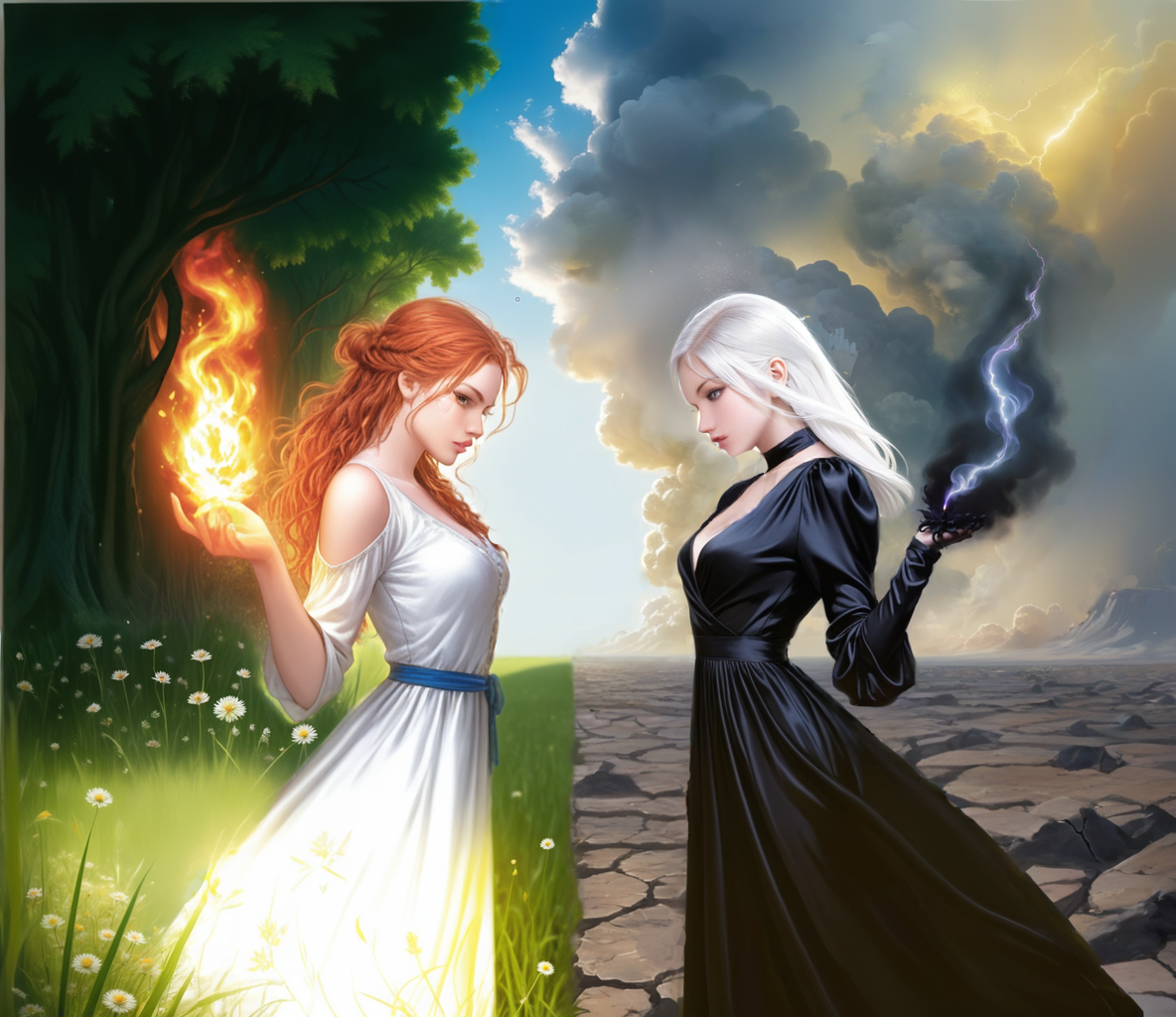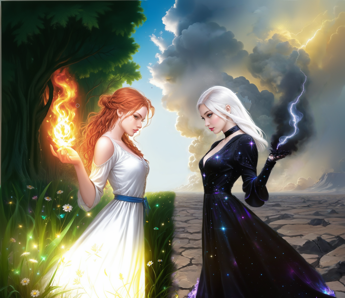 Главная героиня - девочка-жизнь, 19-21 год, яркая, шебутная, растрепанные рыжие волосы, зеленые глаза, веснушки. Целительница (по желанию, можно отразить в одежде или нарисовать золотой медальон). Теплые оттенки.