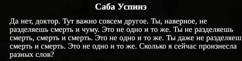 Но зато символичные сны (даже несколько), а еще заигрывание на тему театра и масок. Так что там еще и вопросы по типу "Мы играем Артемием или актером, который притворяется Артемием?". Таким макаром даже по-своему вписываются игровые смерти персонажа - другой актер надевает маску. А еще в Театре там можно посмотреть на самого себя и увидеть предсказание будущего. Та же Инквизитор Аглая появляется на сцене Театра раньше, чем сама Аглая приходит в Город. Сцена похорон куклы.