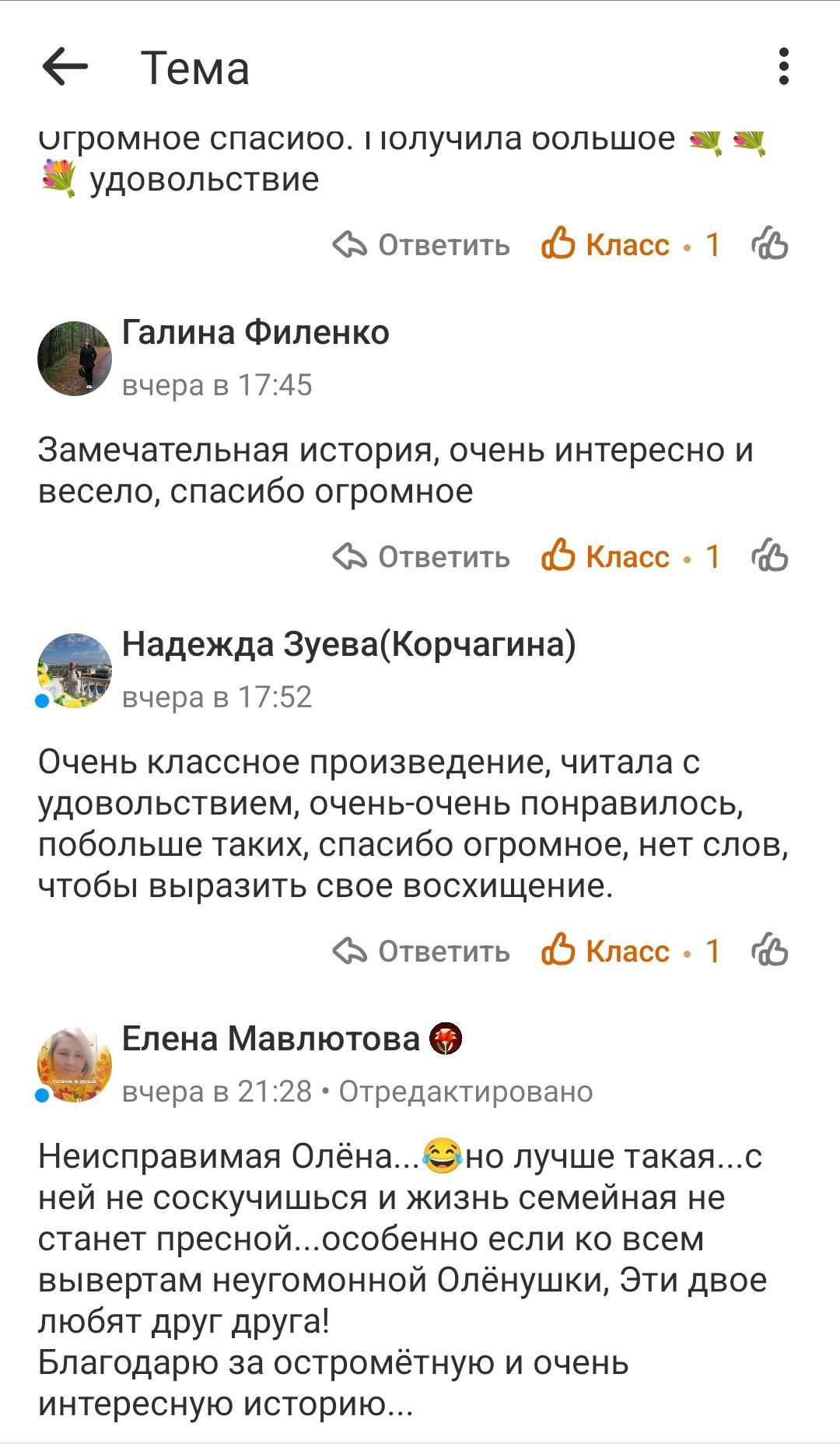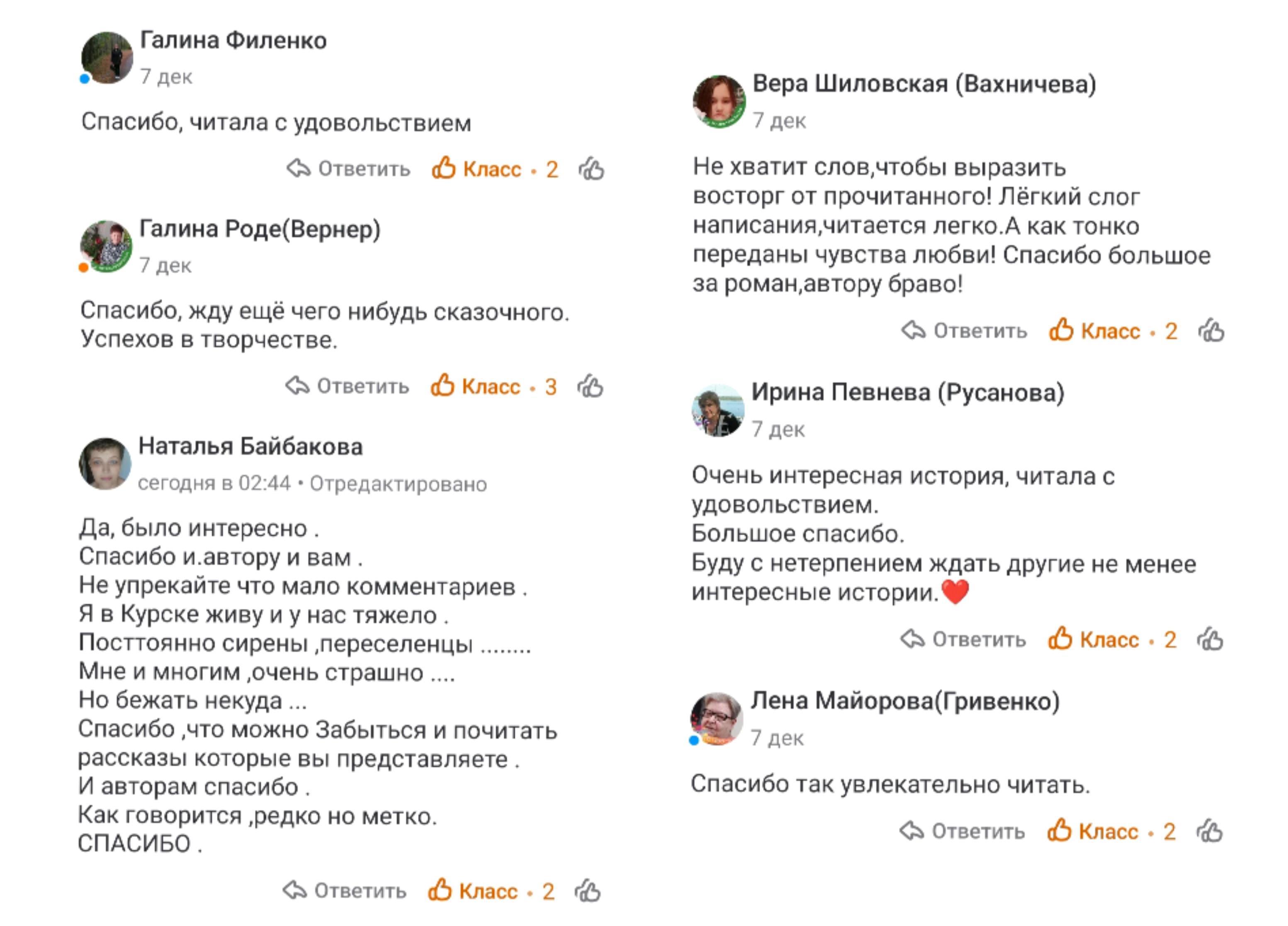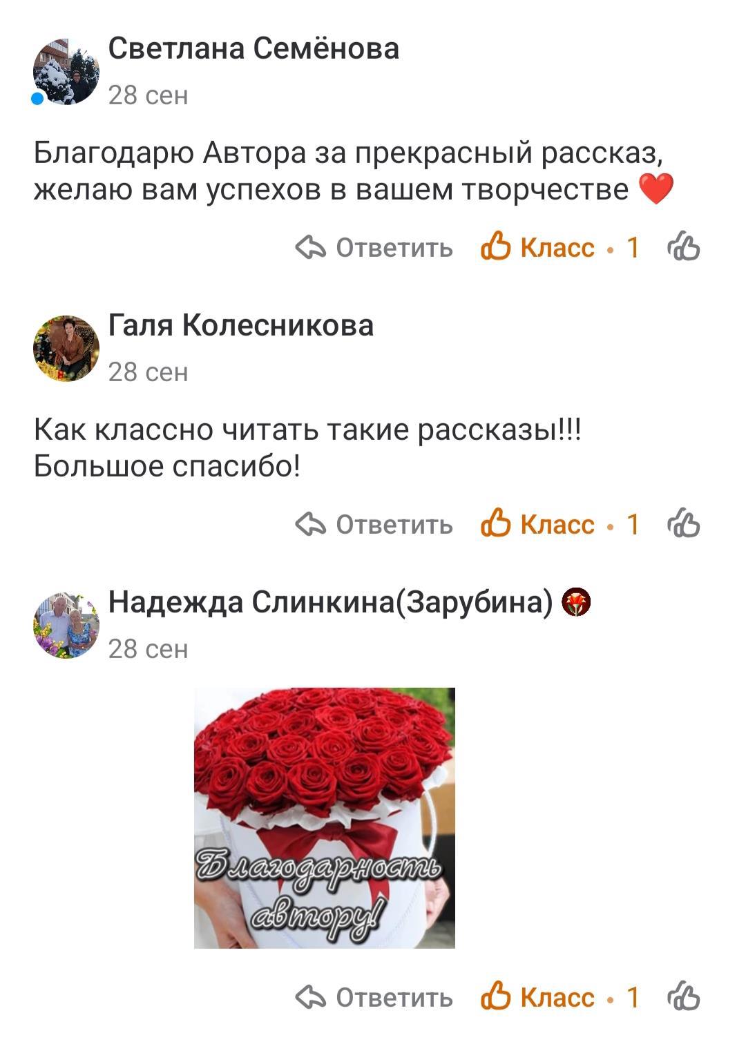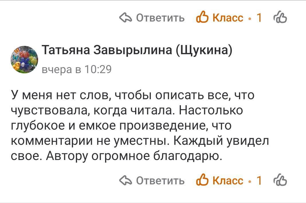 Прочитали вашу замечательную историю в группе. Всем очень понравилась. Творческих успехов вам и вдохновения! Привожу только два из всех восторженных комментариев.