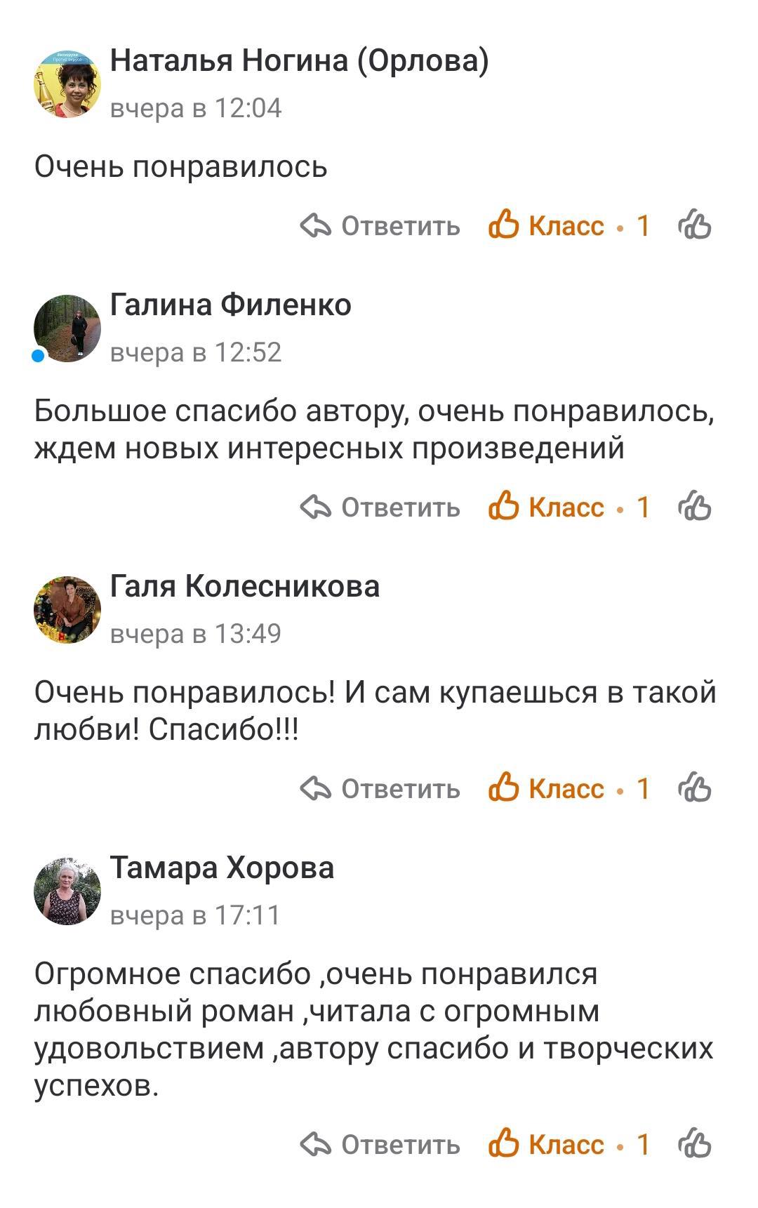 Дорога Элина. Спасибо вам за удивительную историю. Мы читали ее в группе на ОК. Читатели были в полном восторге. Мы открыли для себя нового автора и очень благодарны, что книги в свободном доступе. В группе много пожилых людей, которые не имеют возможности покупать книги. Хочу поделиться с вами некоторыми комментариями о вашей книге. Ещё раз спасибо. Будем с удовольствием читать ваши истории. Оставлю ссылку в группе на вашу страничку на АТ, уверена, у вас добавится почитателей таланта.