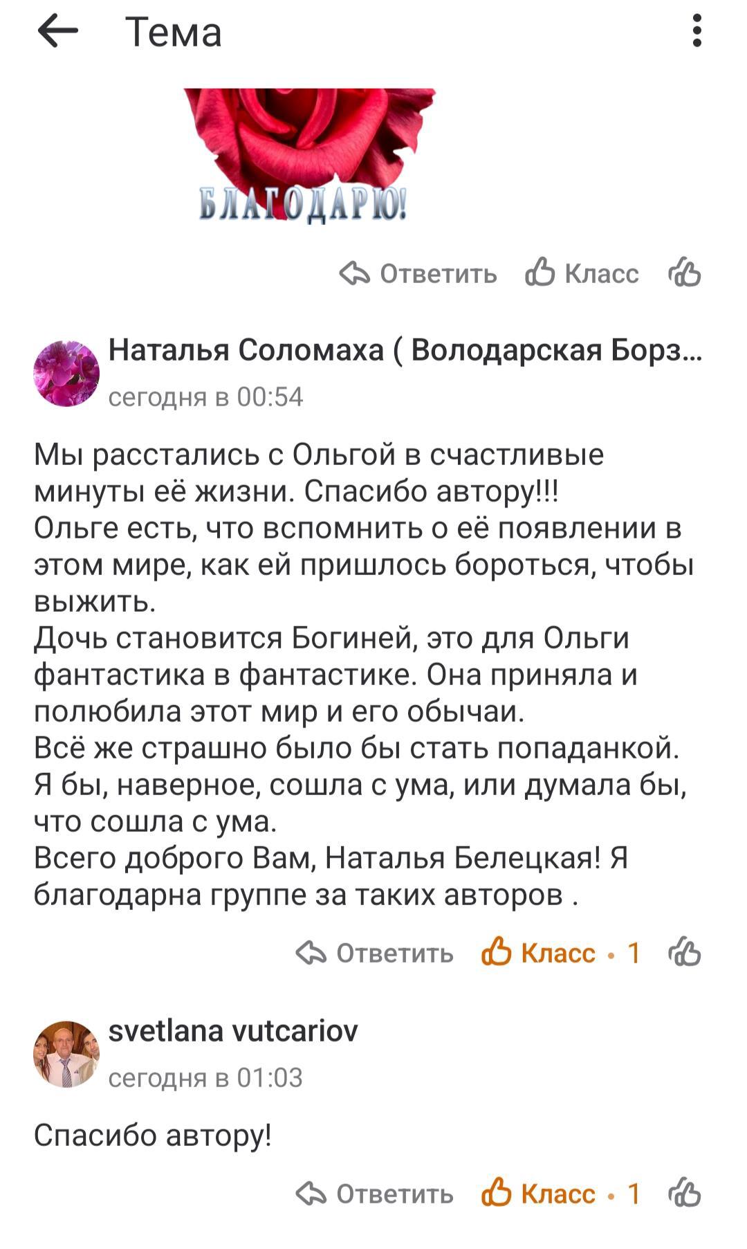 Читали вашу книгу в группе. Было много комментариев, все хорошие, но один я хотела бы вам вложить. Спасибо за интересную и захватывающую историю. Успехов вам