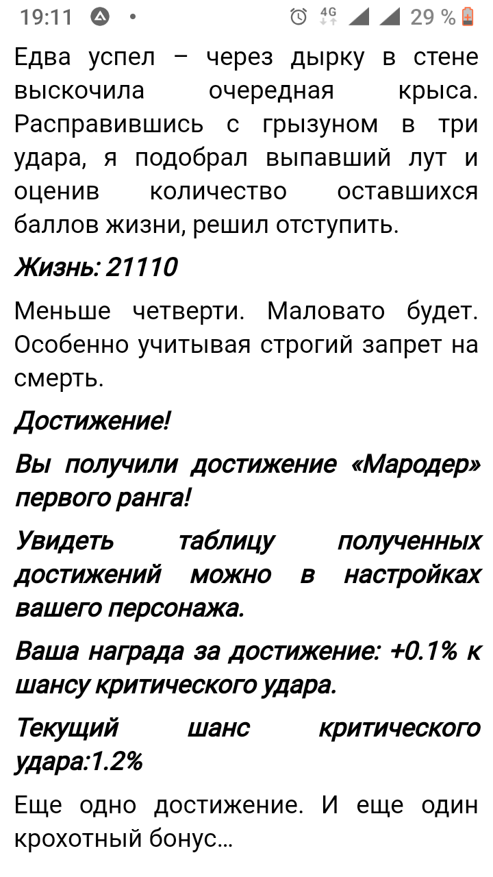Оч круто, отличный язык ( слог), сюжет очень даже неплохой. Даже не так, хороший, множество вариантов развития. Рояли? Ну ,а что рояли, это неотъемлемая часть этого жанра. И эти рояли мне понравились. Спасибо автор , пиши ещё, прекрасный задел на серию, как минимум пяти книг. Больше не стоит. Не превращайте будущий шедевр в бесконечный Файрол или Вальдиру. Помните, как вовремя закончилась ИЧЖ ...